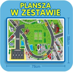 El paquete incluye 3 cochecitos de bomberos, señales de tráfico y una alfombrilla de carretera con la ruta de salida marcada.