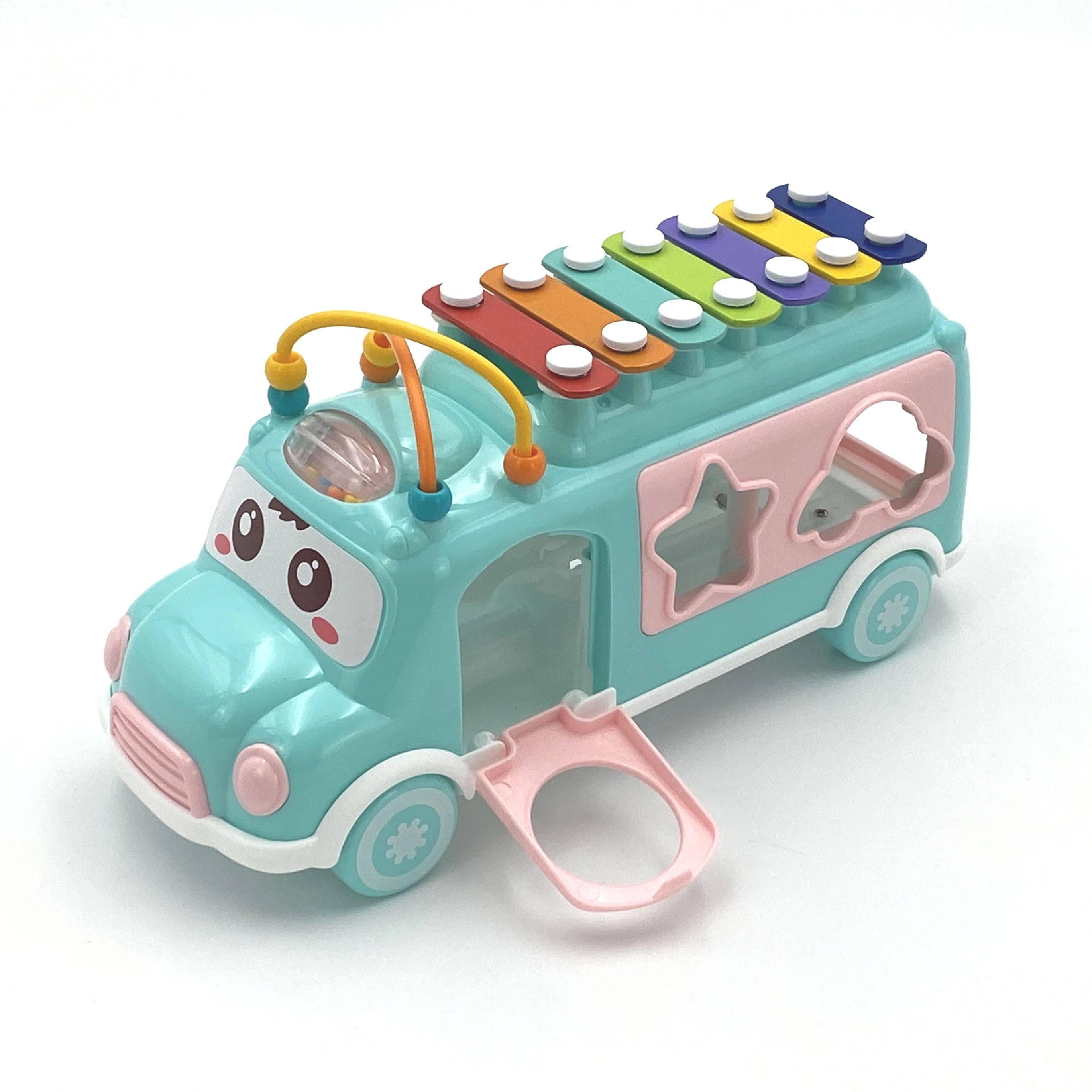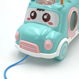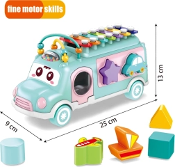 El coche musical cuenta con muchos elementos para manipular y descubrir. El niño puede usar el martillito incluido para tocar el xilófono de colores situado en el techo del vehículo. En los laterales del coche hay orificios de diferentes formas y se incluyen bloques de colores que pueden insertarse en dichos orificios. Este juego ayuda al niño a desarrollar las capacidades de coordinación y el reconocimiento de colores y formas. Las bolitas en el techo, que el niño puede deslizar, entrenan su destreza y concentración.