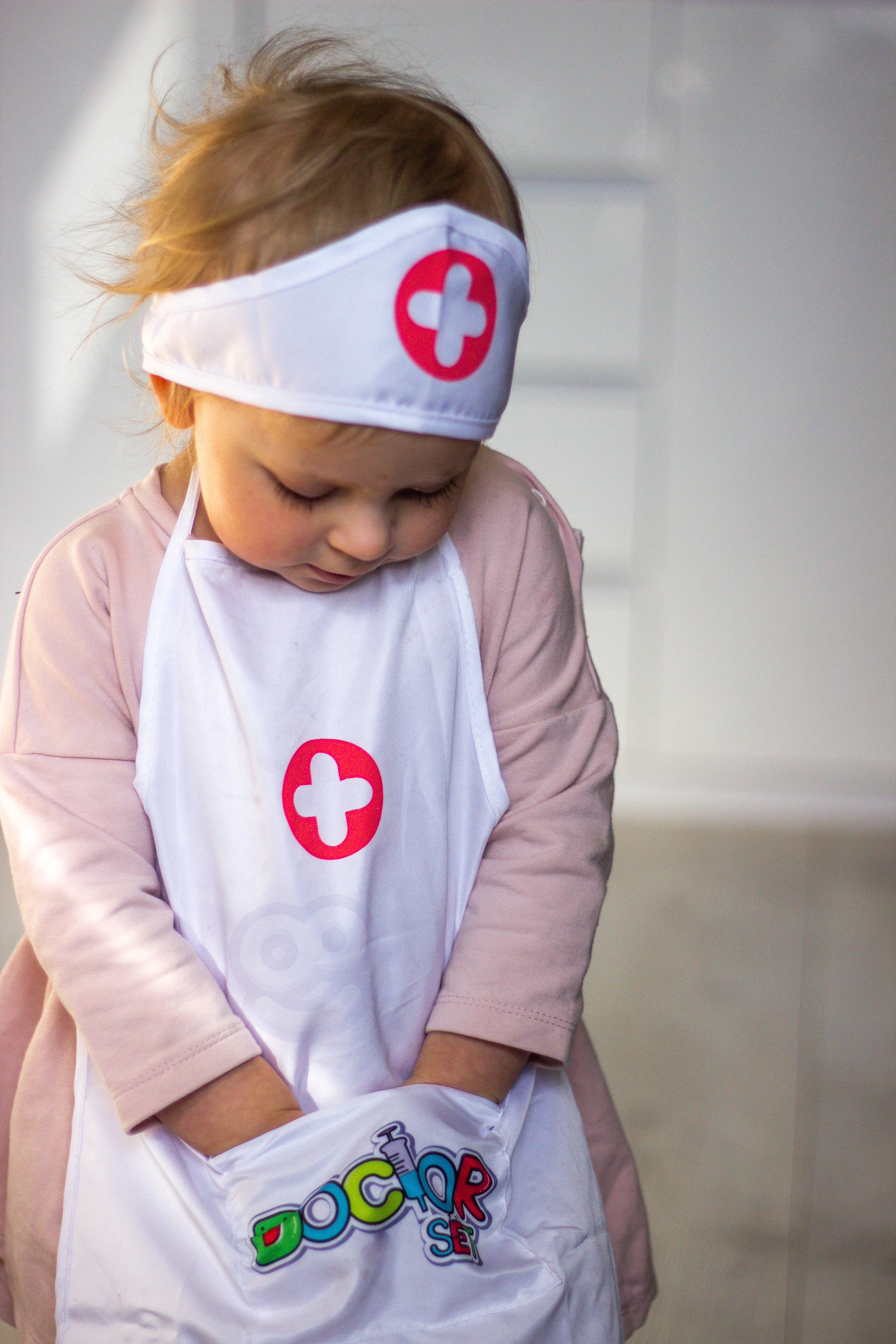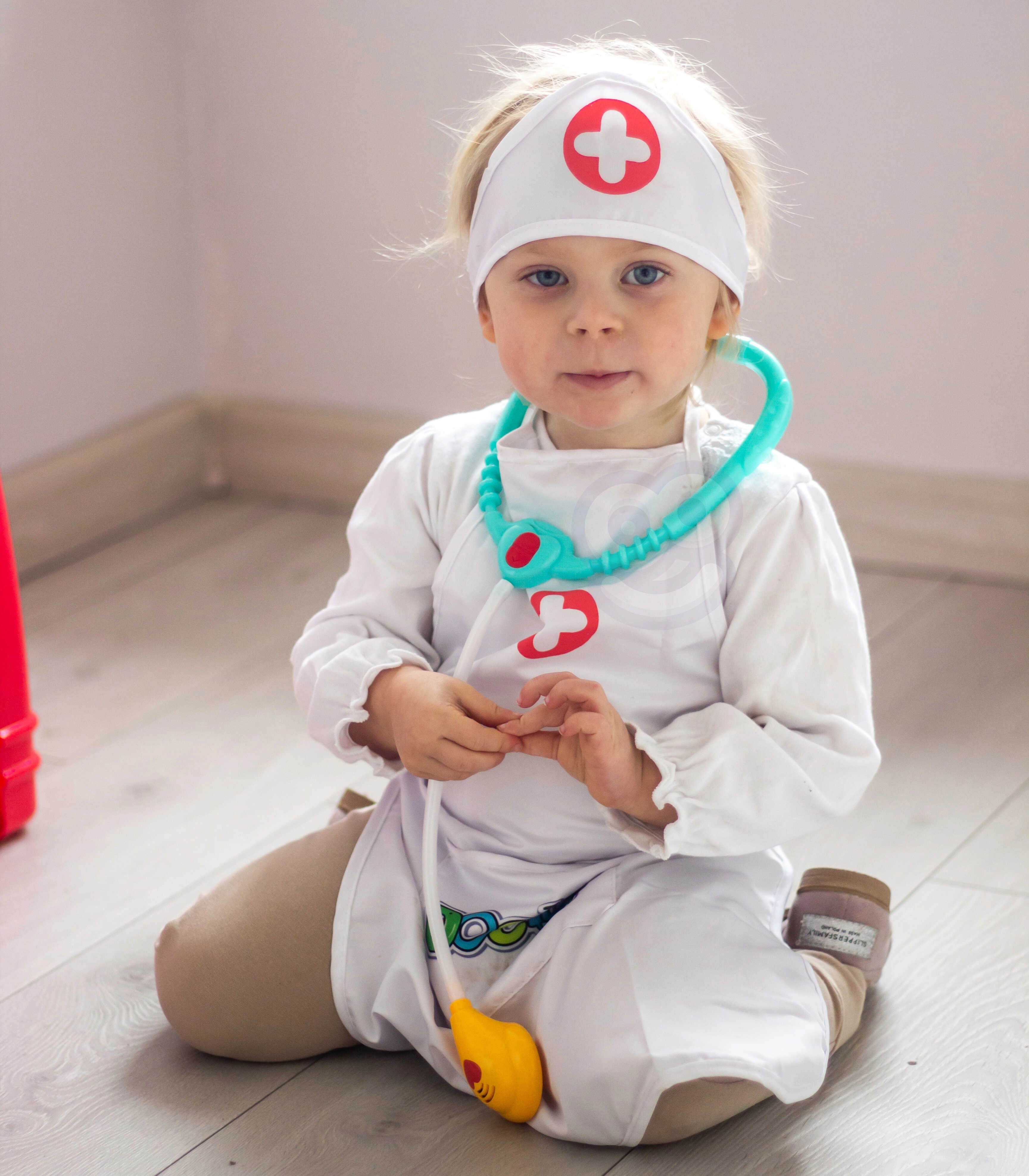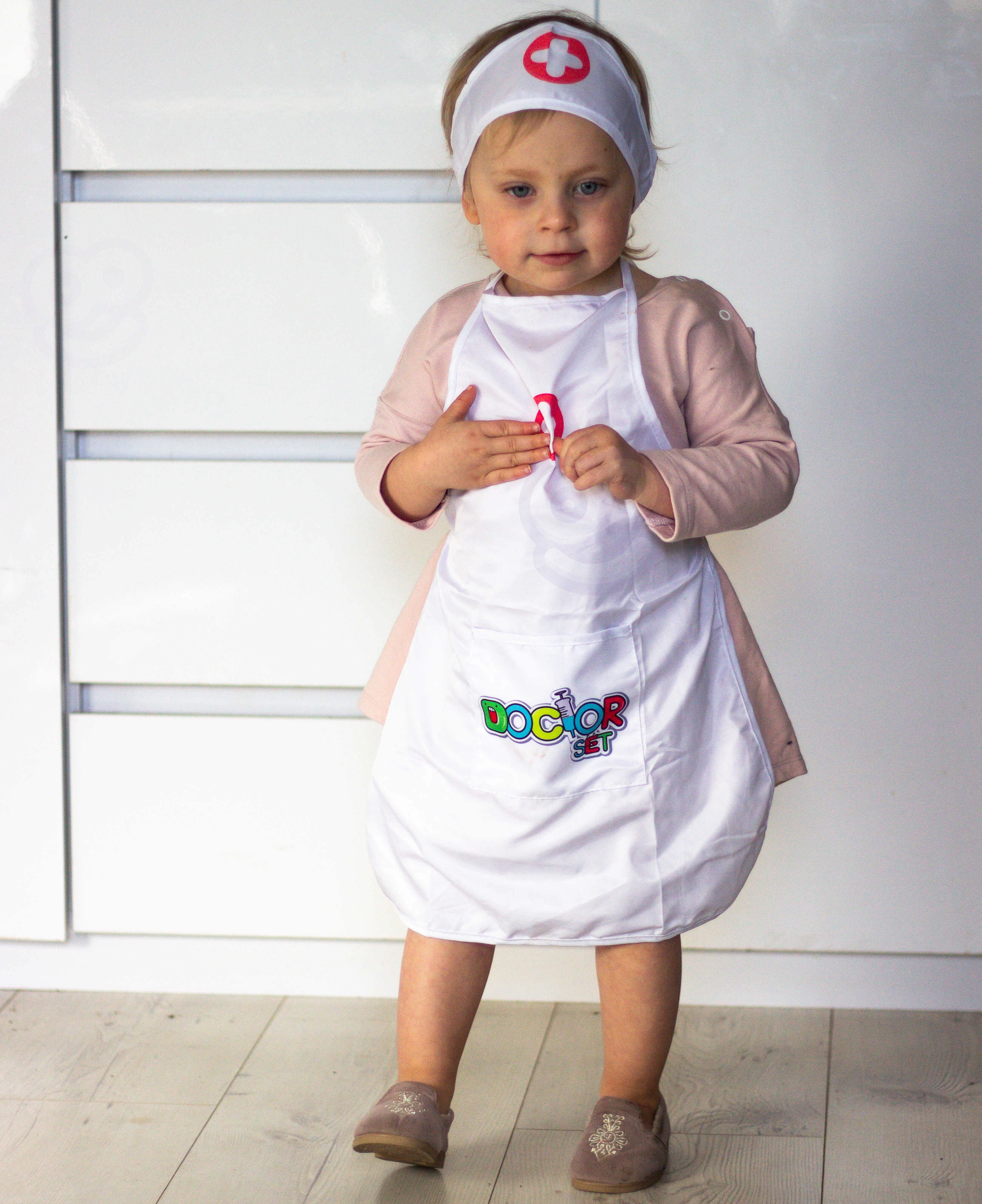 Delantal ligero con bolsillos prácticos que pueden guardar un estetoscopio y otros accesorios infantiles, para que el juego de doctor esté siempre a mano.