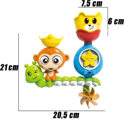 Este juguete de baño interactivo WOOPIE convierte cada baño en un momento de alegría. Al verter agua en el gorro del monito se activa una divertida cascada: los ojos giran, la boquita se abre y el agua cae directamente a la bañera. La oruga con expresión guiñando y la estrellita dirigen el chorro hacia la ruedita giratoria, que mezcla el agua y añade otro efecto.