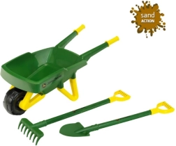Carretilla infantil ligera pero estable en los colores JOHN DEERE, capaz de con arena, tierra y hojas, que promueve el movimiento natural al aire libre.