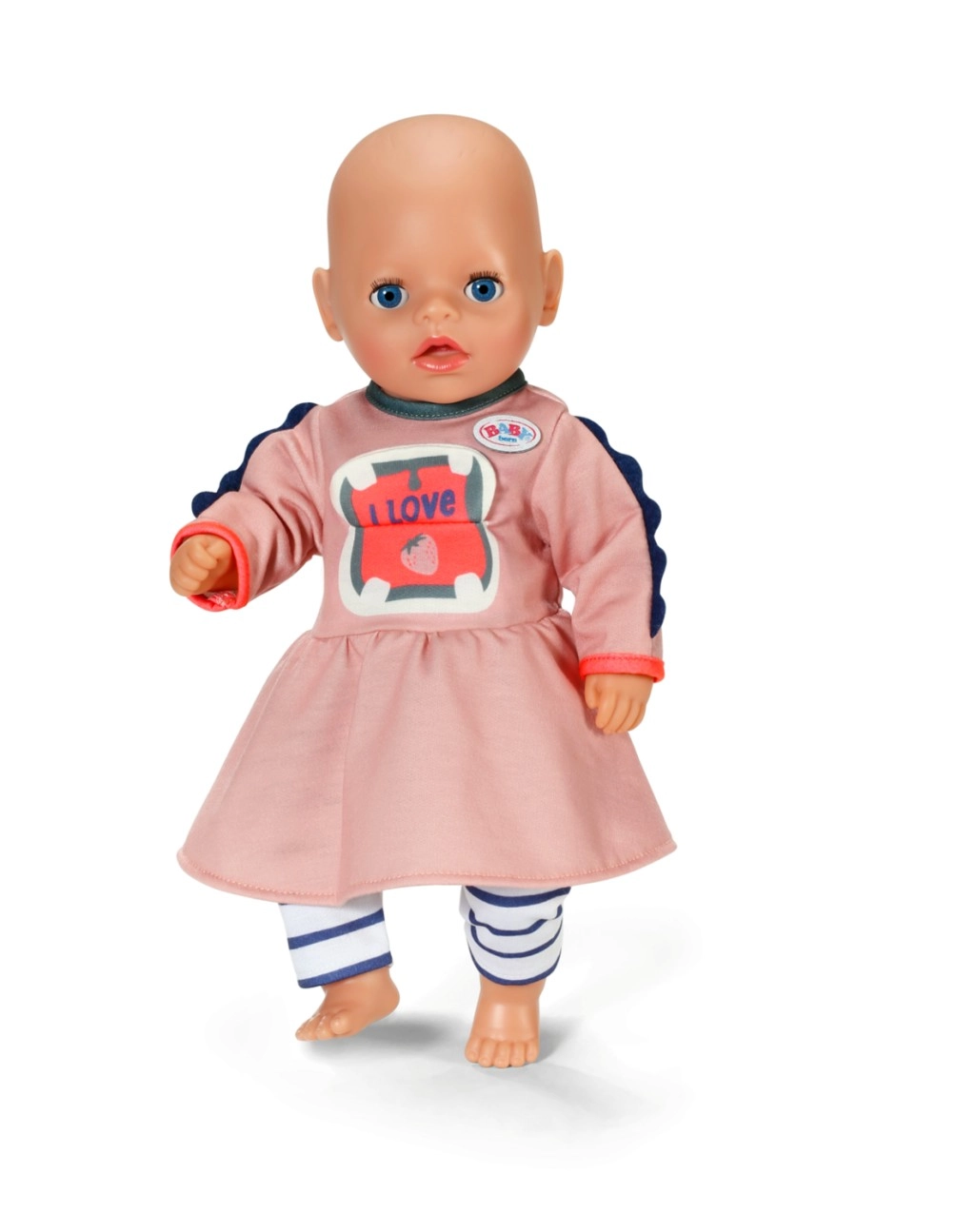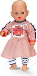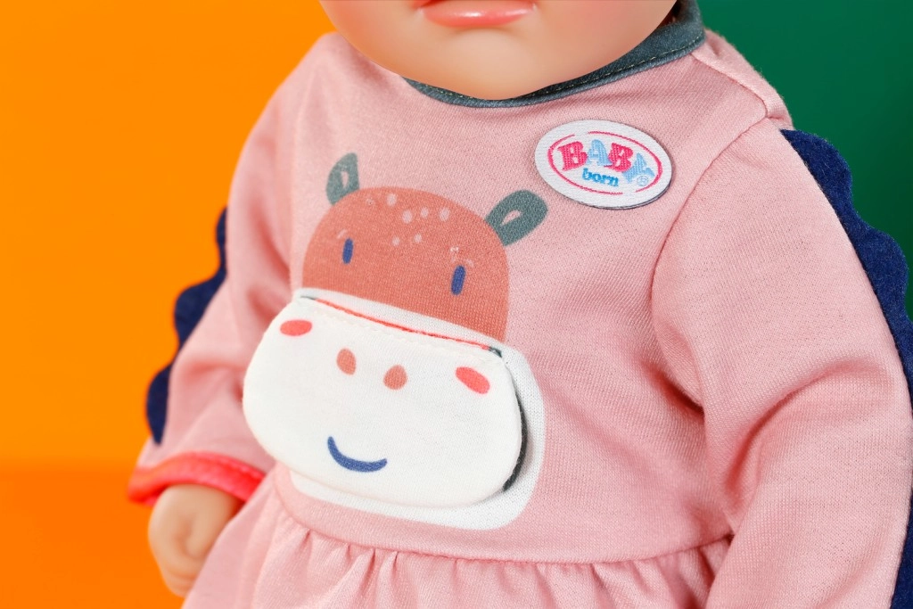 Adorable juego para muñecas BABY born de 36 cm que incluye un vestidito rosa con motivo de hipopótamo y leggings a rayas. Gracias al elemento interactivo: la boca del hipopótamo que se abre, los niños disfrutarán de aún más diversión. Incluye percha de material reciclado y una fabricación de calidad para un juego creativo y variado.