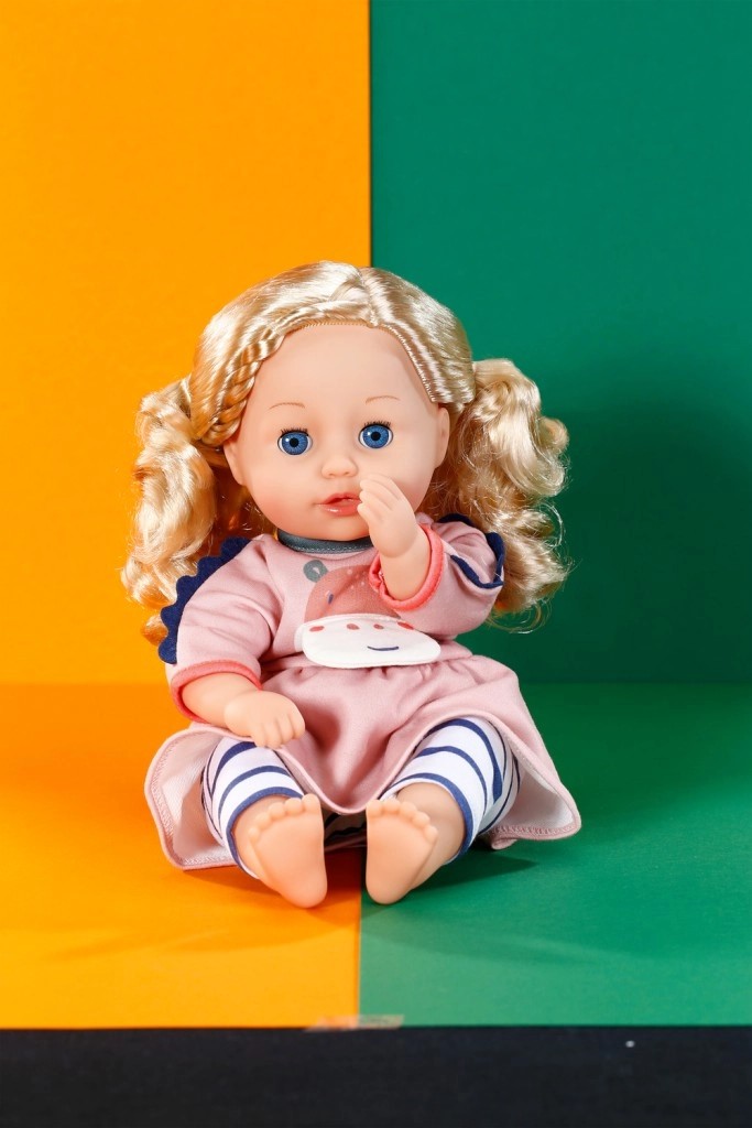 El vestidito en suaves tonos rosados con estampado de hipopótamo y los leggings a rayas a juego le dan a la muñeca un aspecto irresistible.