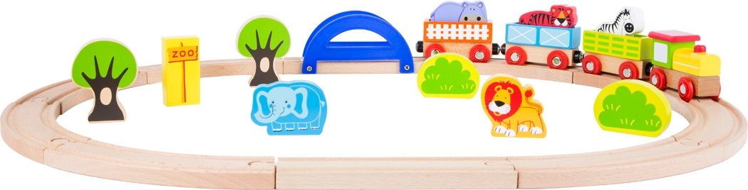 Óvalo de vías, puente, árboles, arbustos, señal de ZOO y figuras de animales: todo en un solo paquete para un juego imaginativo enriquecedor.