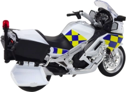 Este modelo de motocicleta policial, trabajado con detalle, combina materiales resistentes con un aspecto auténtico. Piezas metálicas, plástico de calidad y elementos móviles, como espejos o faros, crean una réplica fiel de un vehículo real. Gracias a los efectos de luz y sonido integrados, el juego es aún más realista y divertido.