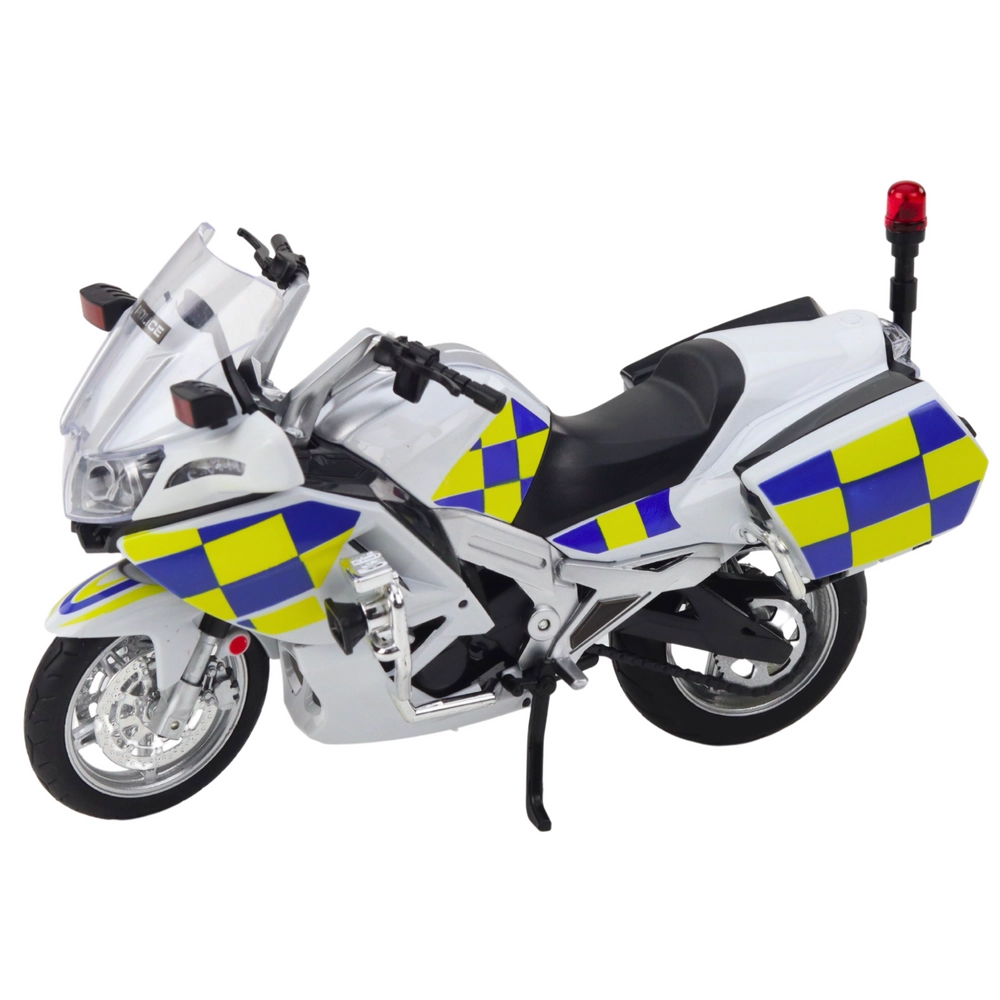 Carrocería blanca con patrón ajedrezado azul‑amarillo, pantalla transparente y elementos detallados que crean la apariencia fiel de una moto de servicio.