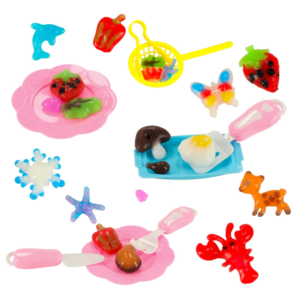 Contenido del paquete: El set incluye 12 botellitas de gel en diferentes colores, 24 moldes, un vasito con lactato cálcico, 4 platillos, 4 bandejas, 2 coladores, 2 pinzas, 1 taza con tapa para juegos interactivos y más.