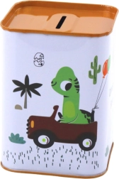 Las alegres ilustraciones de un dinosaurio en coche y los colores vivos convierten la hucha también en una preciosa decoración.