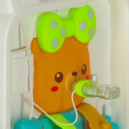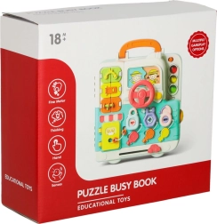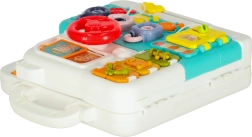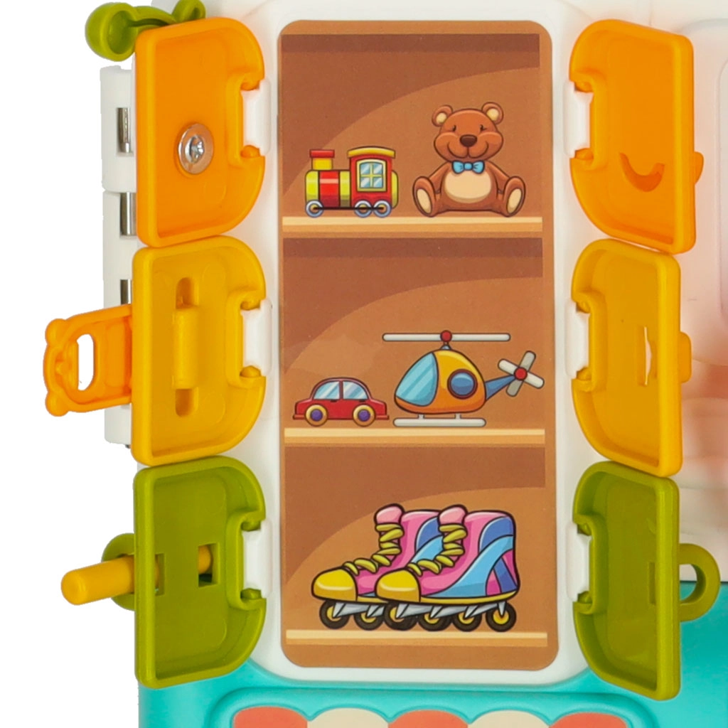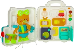 El maletín se lleva fácilmente a cualquier parte: a casa de los abuelos, de vacaciones o de visita. Los materiales resistentes, los bordes redondeados y los mecanismos seguros garantizan un juego tranquilo. Los dos niveles de volumen agradarán a los padres, y los efectos de luz atraerán la atención infantil. Incluye un adorable osito para practicar el abrochado (hebillas, cordones, broches), mini elementos “AGD” y puertecitas con distintos tipos de cierre.