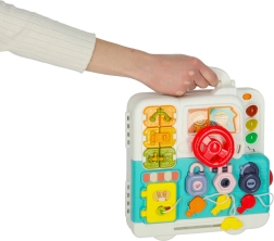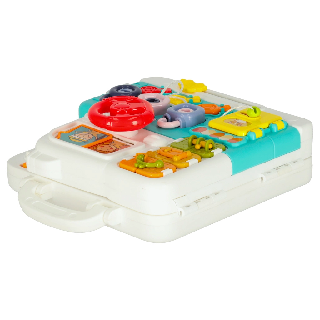 Este ingenioso maletín manipulativo es un pequeño taller de habilidades que guía a los niños de forma natural a explorar el mundo. En su interior les espera una colorida mezcla de elementos interactivos: desde el volante giratorio y las cerraduras, llaves y cordones hasta las lucecitas, botones e interruptores. Los niños entrenan la coordinación mano-ojo, la paciencia y la concentración, y comprenden el principio de causa y efecto.