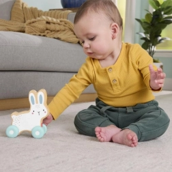 Este encantador conejito con ruedas inspira a los más pequeños al juego activo: desde los primeros toques y empujones mientras están sentados hasta gatear y perseguir el juguete por el suelo. Su forma compacta se adapta muy bien a las manos pequeñas y el desplazamiento suave favorece la coordinación de movimientos y la curiosidad natural.