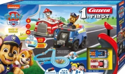 ¡Diversión de carreras para los más pequeños! La pista CARRERA FIRST con licencia de Patrulla Canina ofrece un circuito de 3,5 m con luces y sonidos interactivos, dos cochecitos (Chase y Marshall) y mandos de velocidad. Gracias al montaje sencillo, los imanes y los cepillos de contacto, los coches se mantienen perfectamente en la pista. Pista ideal a pilas para niños a partir de 3 años.