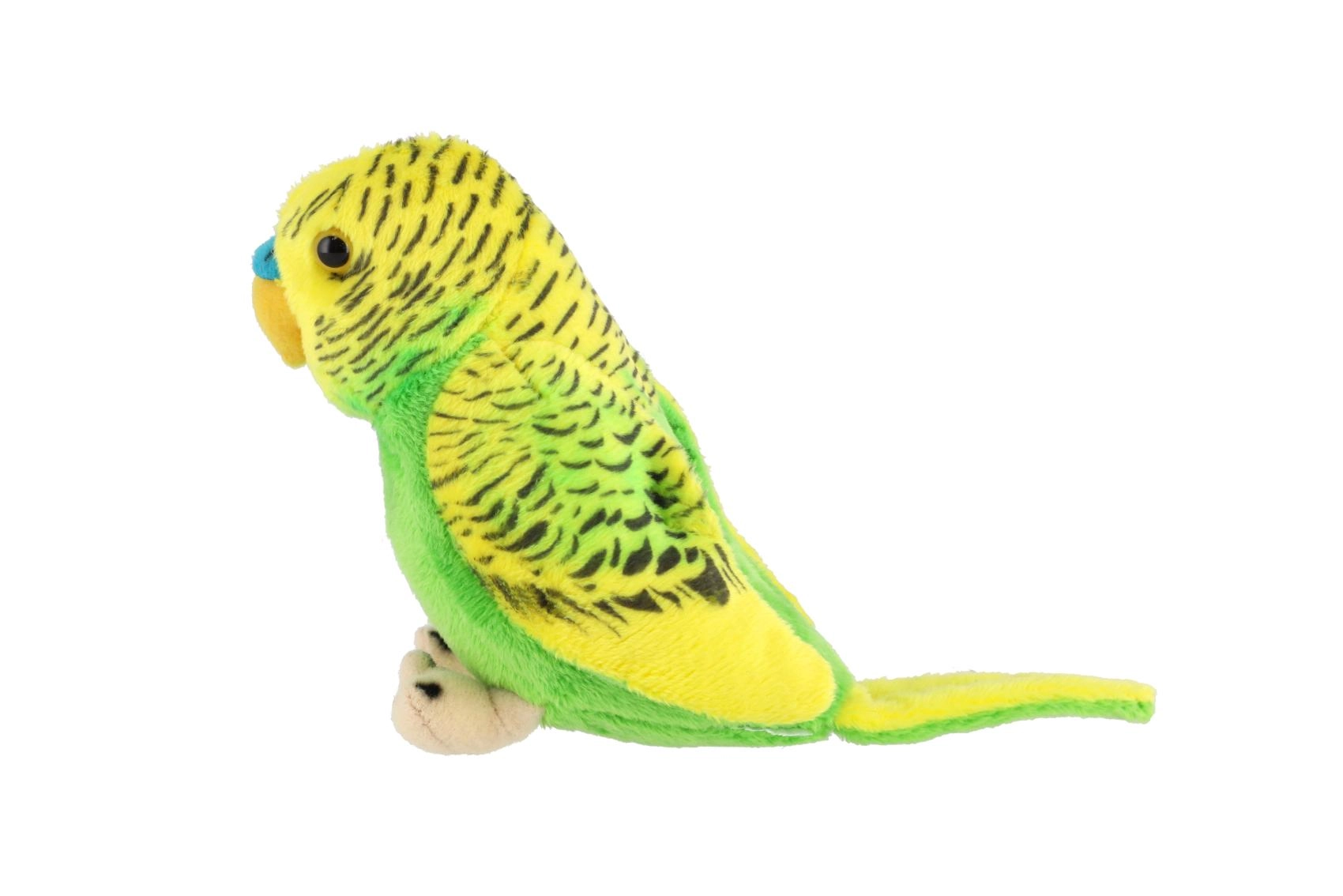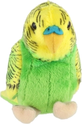 Coloración verde‑amarilla con marcas típicas y detalles bordados que recrean fielmente el aspecto del periquito.