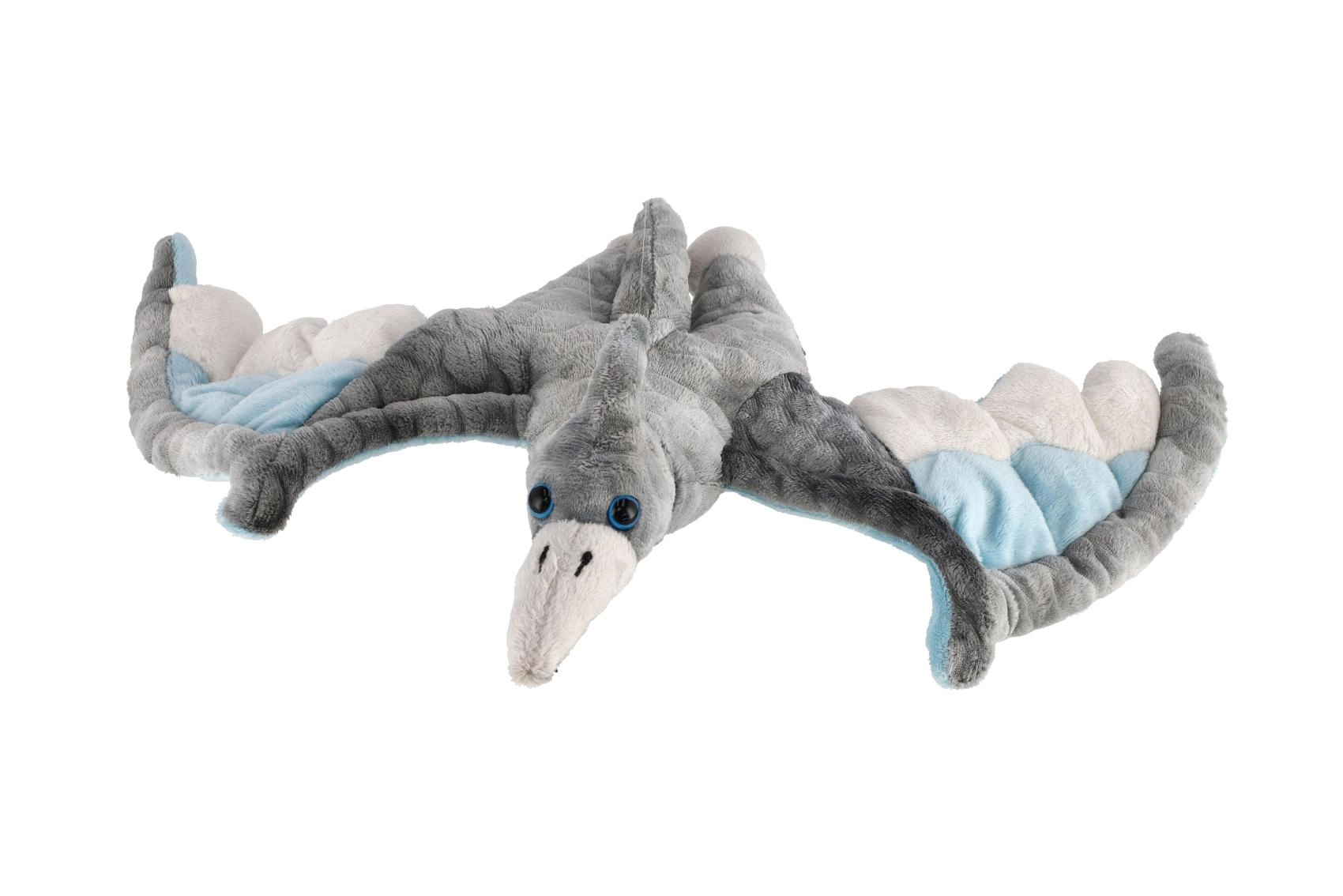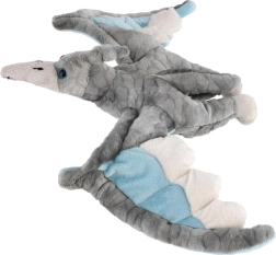 Este pterosaurio suave destaca por sus alas extendidas en color gris con detalles azules y claros. Es agradablemente esponjoso, ligero y se adapta muy bien a las manos pequeñas. Gracias a sus materiales delicados, es ideal como primer peluche y pronto se convertirá en un compañero favorito para dormir y viajar.