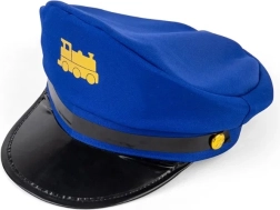 La gorra azul con visera negra brillante y emblema amarillo de tren crea al instante la atmósfera de un ferrocarril de verdad.