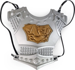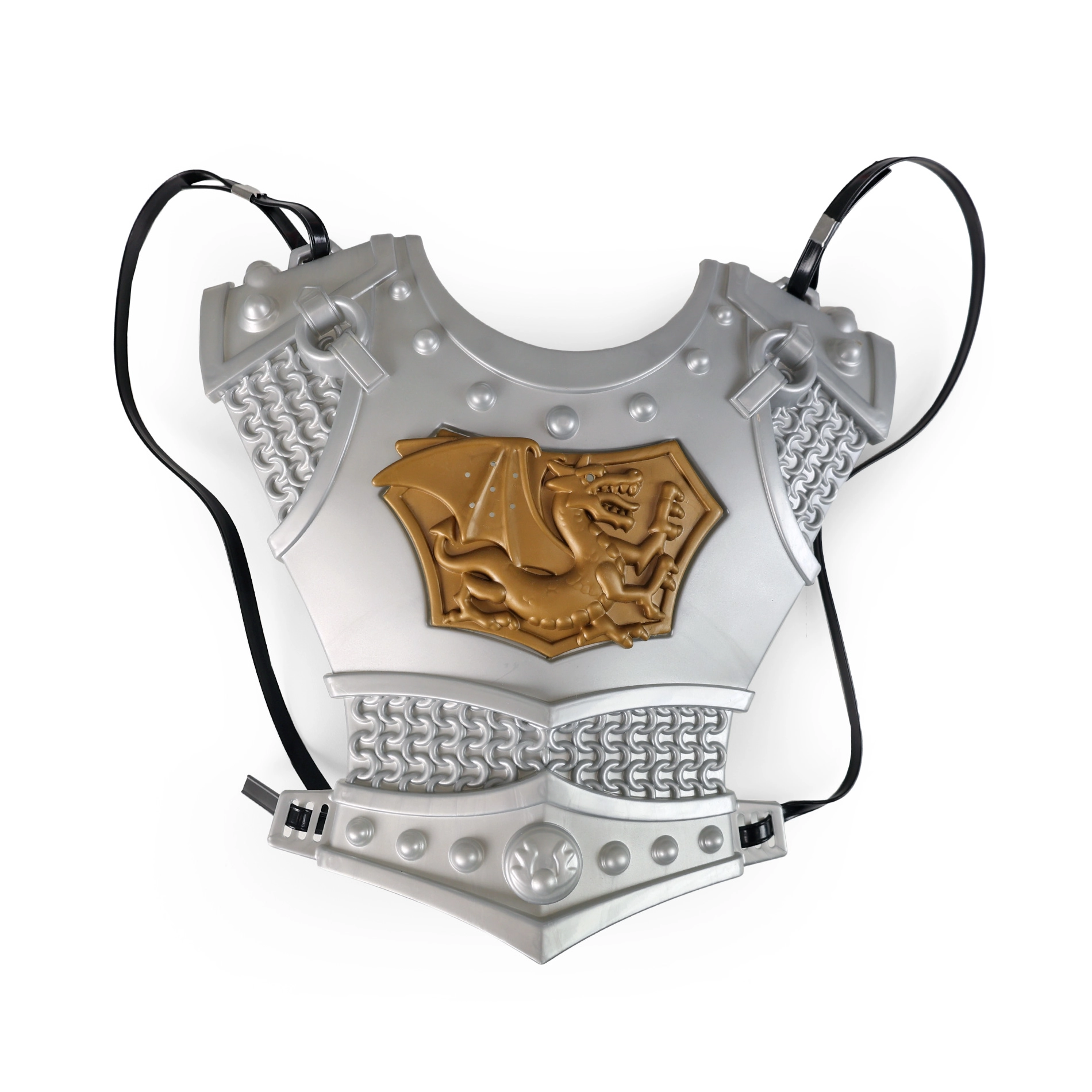 El escudo y la armadura con un emblema de dragón dorado añaden un aspecto impactante al disfraz y realzan su carácter caballeresco.