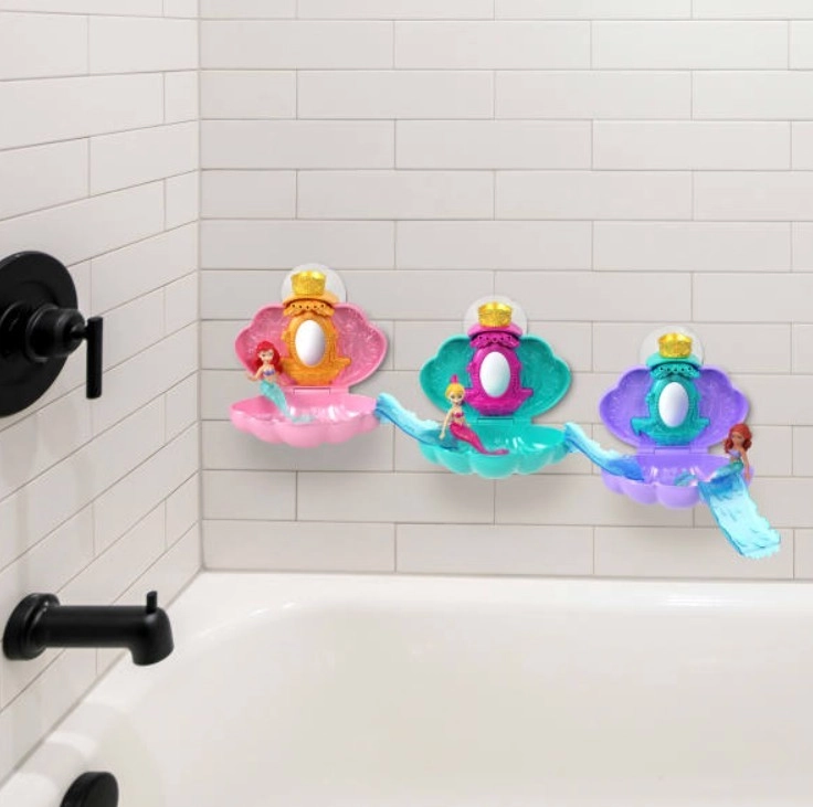 Abre la brillante concha y descubre a la adorable sirena inspirada en el mundo de La Sirenita. Gracias a la ventosa, fija el set a azulejos lisos o al borde de la bañera y lanza a la sirena por el tobogán de agua. Un juguete de baño ideal que fomenta la imaginación y el juego independiente.