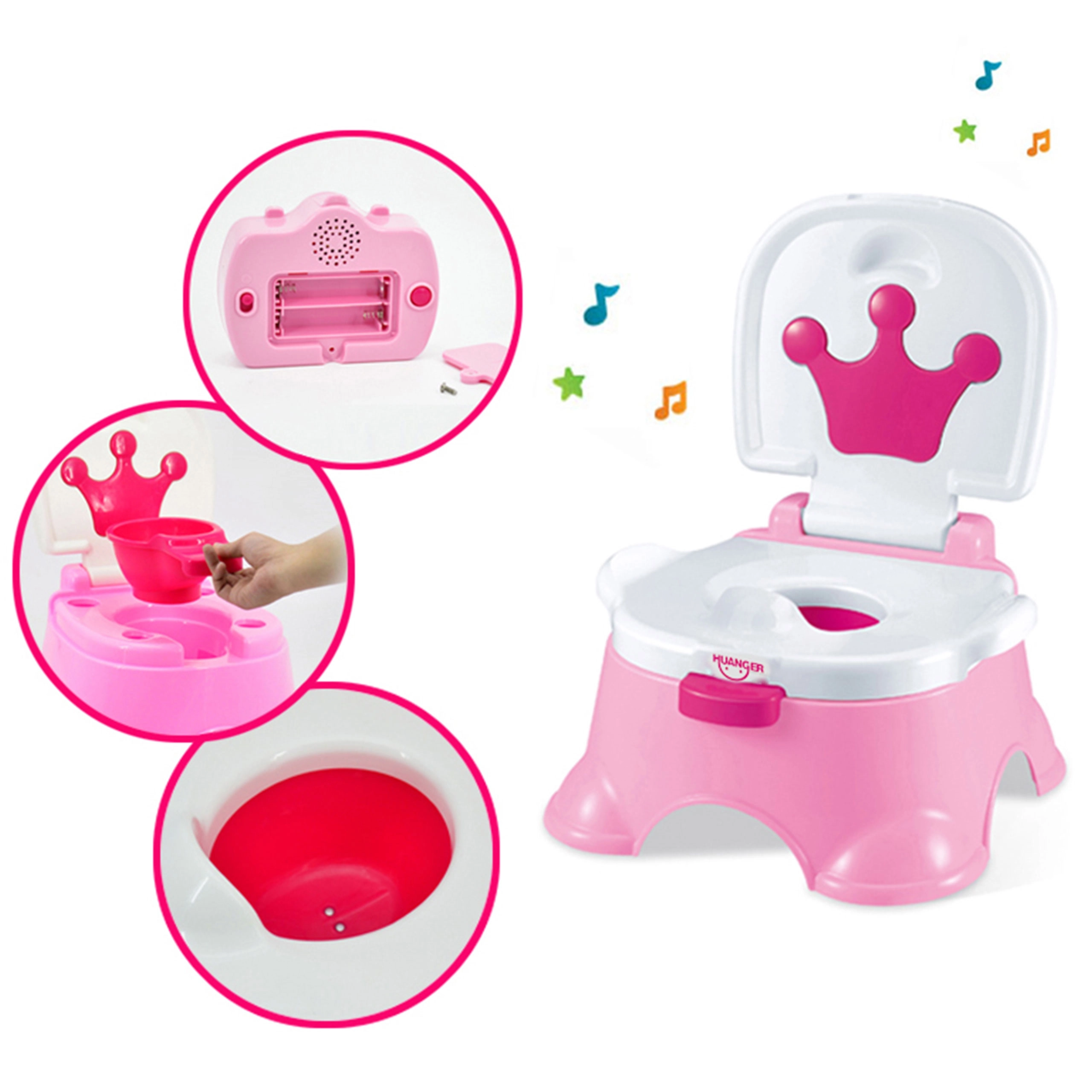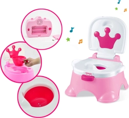 El práctico orinal infantil 3 en 1 de la marca WOOPIE acelera y hace más agradable el aprendizaje para ir al baño. Ofrece orinal, escalón y asiento en uno, cuenta con un asiento ergonómico ancho, asas laterales para la estabilidad y melodías para motivar al niño. Fabricado con plástico de alta calidad y seguro, se limpia fácilmente y gracias a su base estable es seguro para el uso diario.