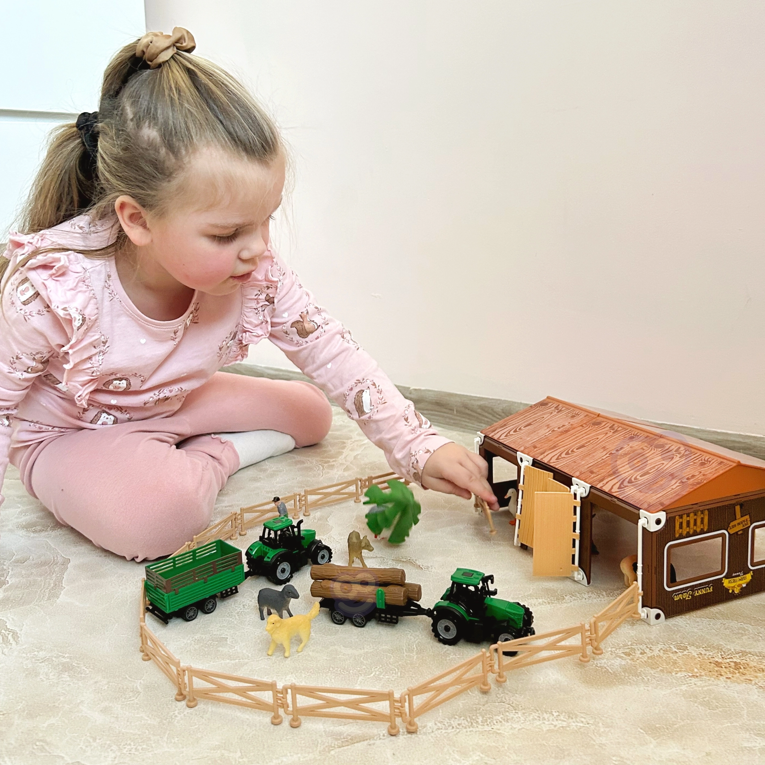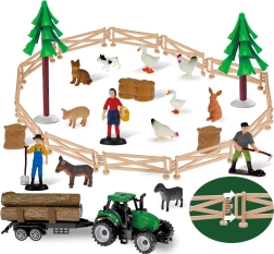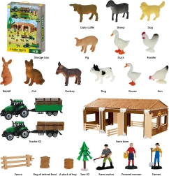 - 12 figuras de animales, 3 figuras de personas, 2 tractores con remolques desmontables, granero/zagroda, cercas y otros accesorios de granja