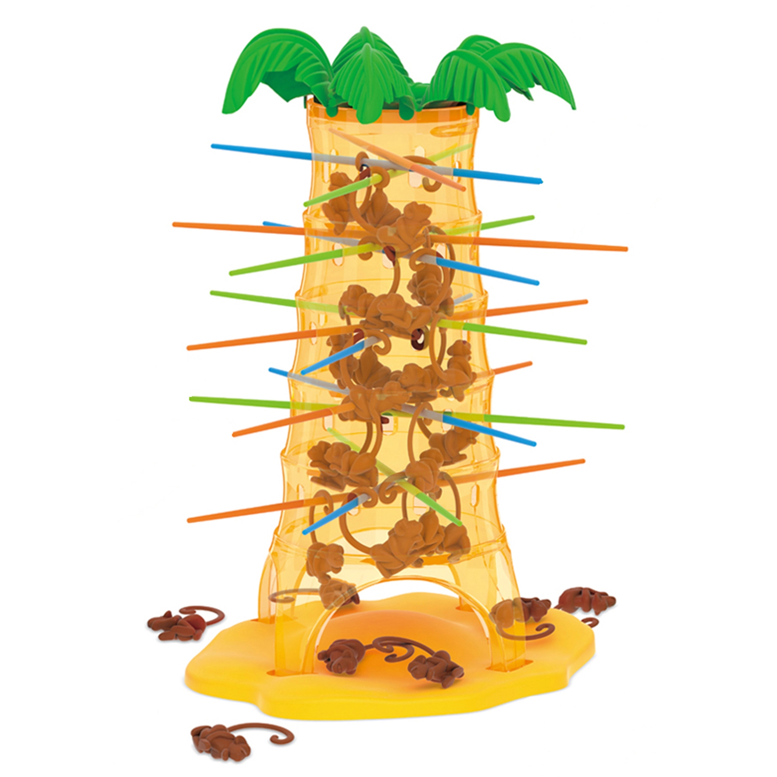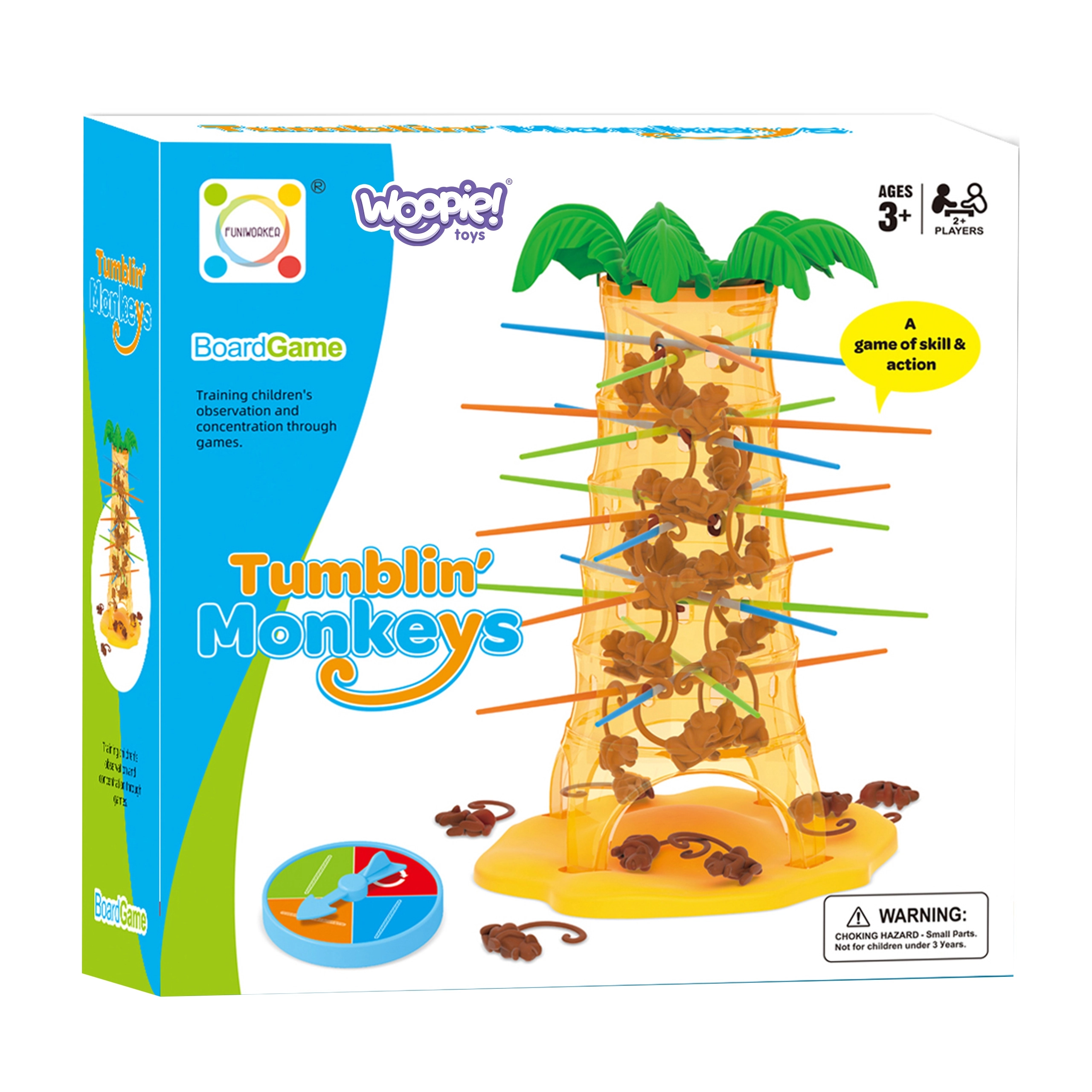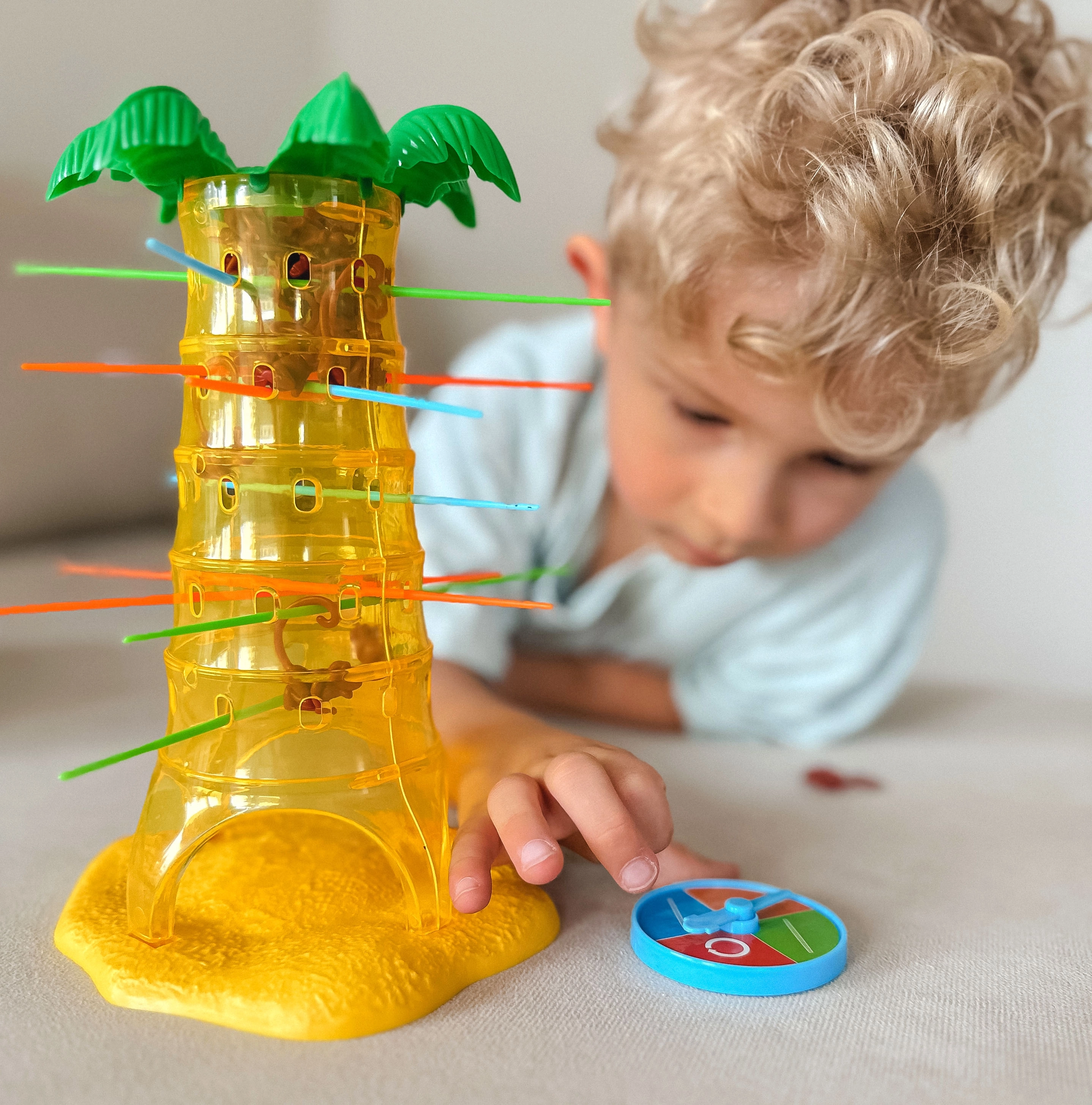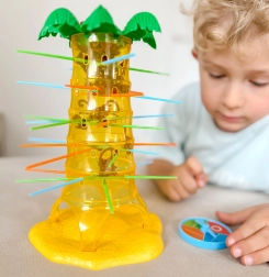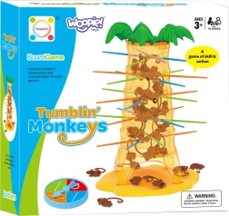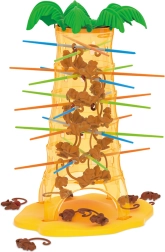 En este fantástico juego de la marca Woopie introduces varillas en los orificios de la palmera y lanzas los monitos sobre ellas. En cada turno giras la ruleta y la flecha determina qué varilla debes sacar. El objetivo es mantener a los monos el mayor tiempo posible en la palmera y evitar que se caigan. Gana quien derribe la menor cantidad de monos.