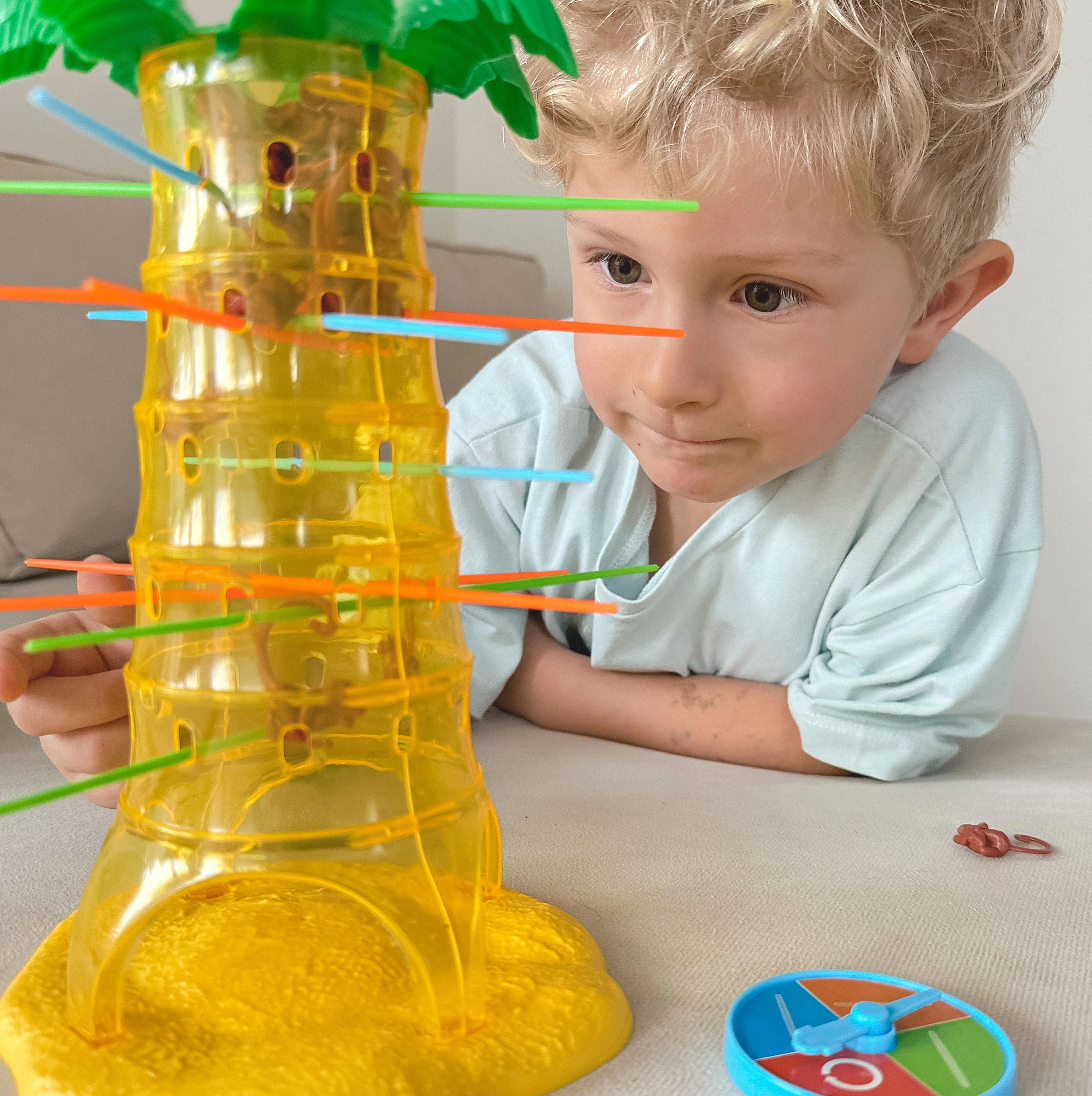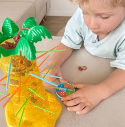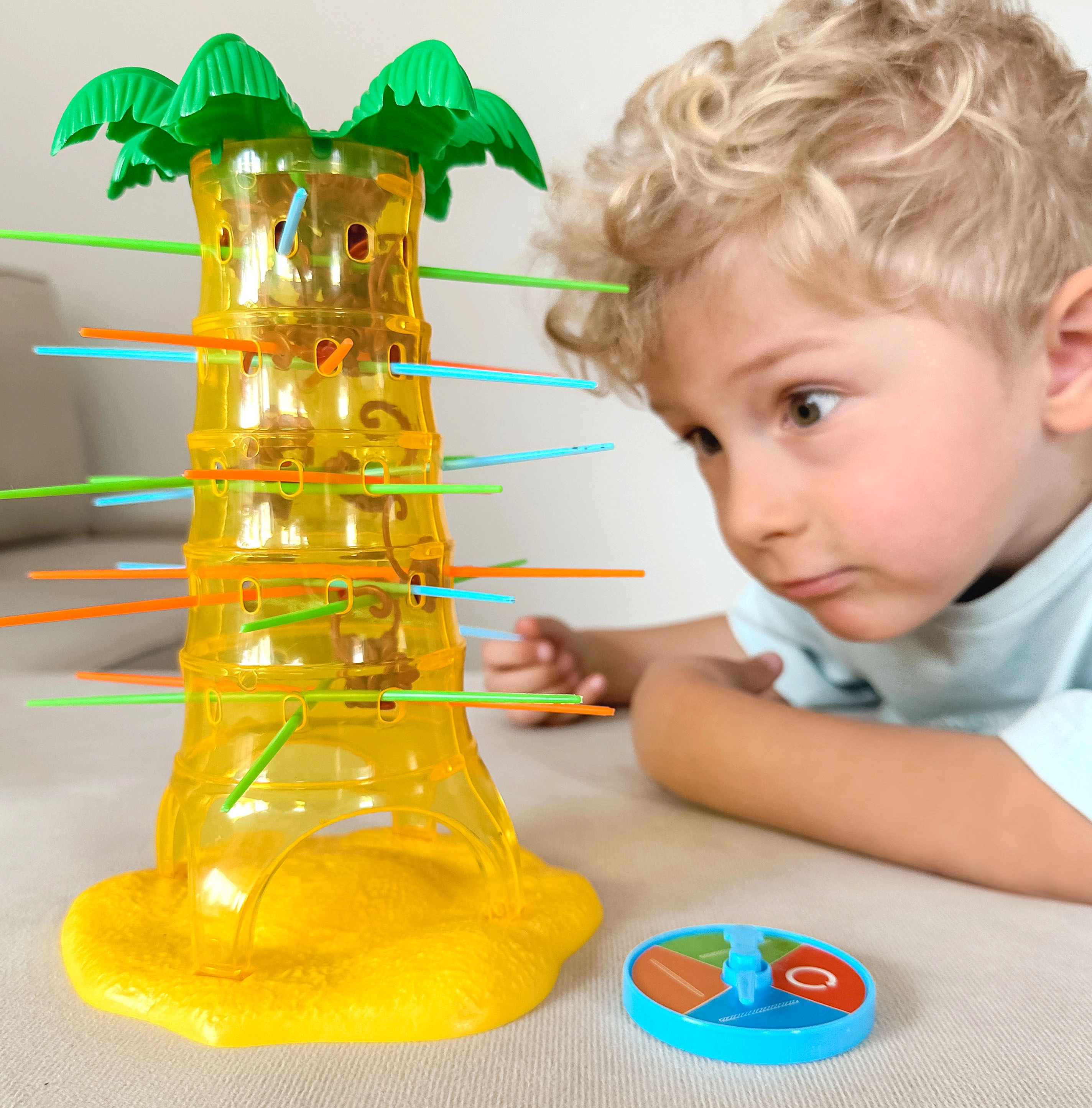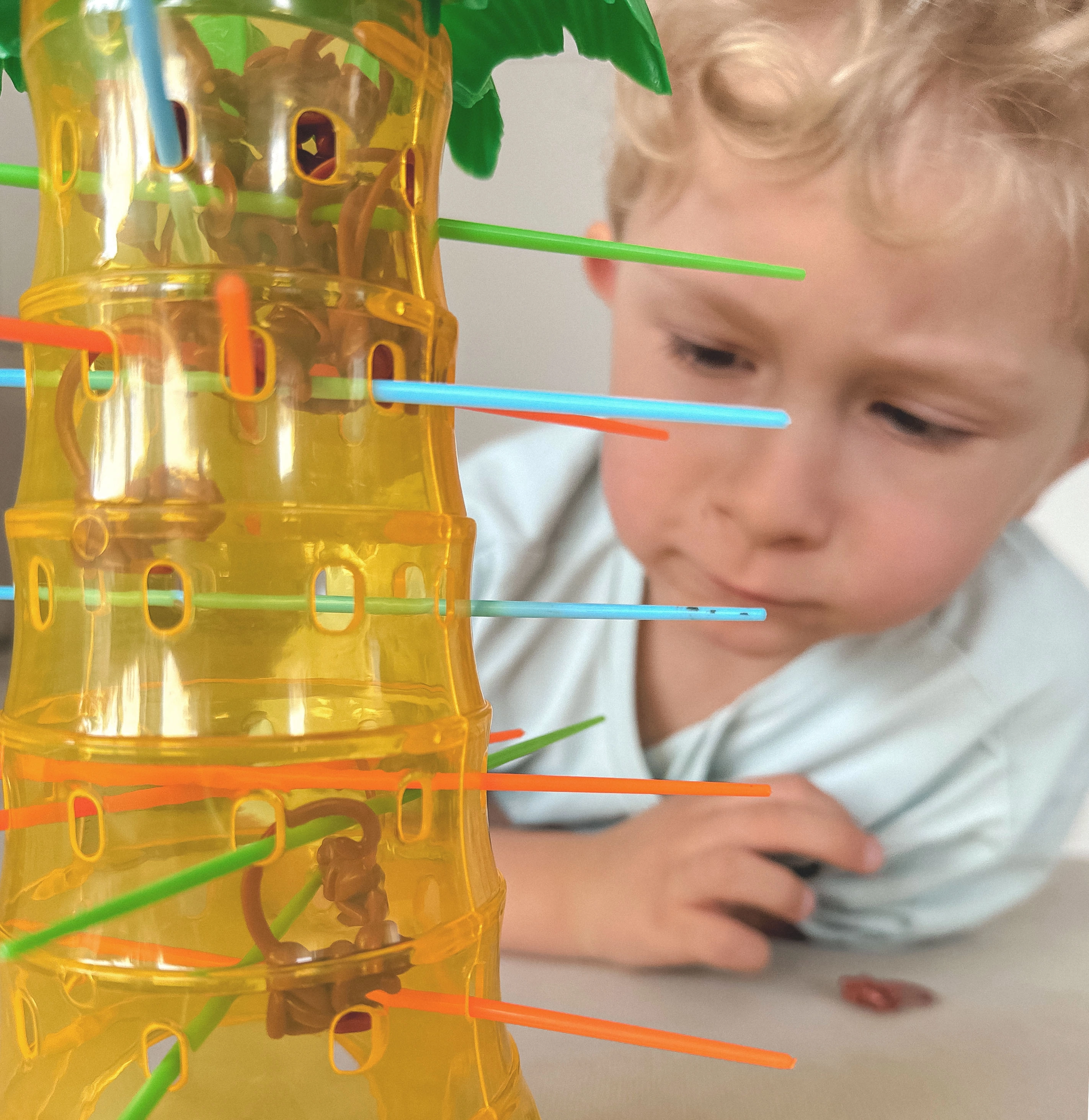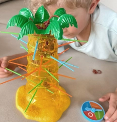 En este fantástico juego de la marca Woopie introduces varillas en los orificios de la palmera y lanzas los monitos sobre ellas. En cada turno giras la ruleta y la flecha determina qué varilla debes sacar. El objetivo es mantener a los monos el mayor tiempo posible en la palmera y evitar que se caigan. Gana quien derribe la menor cantidad de monos.