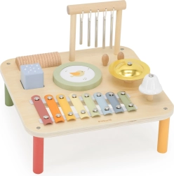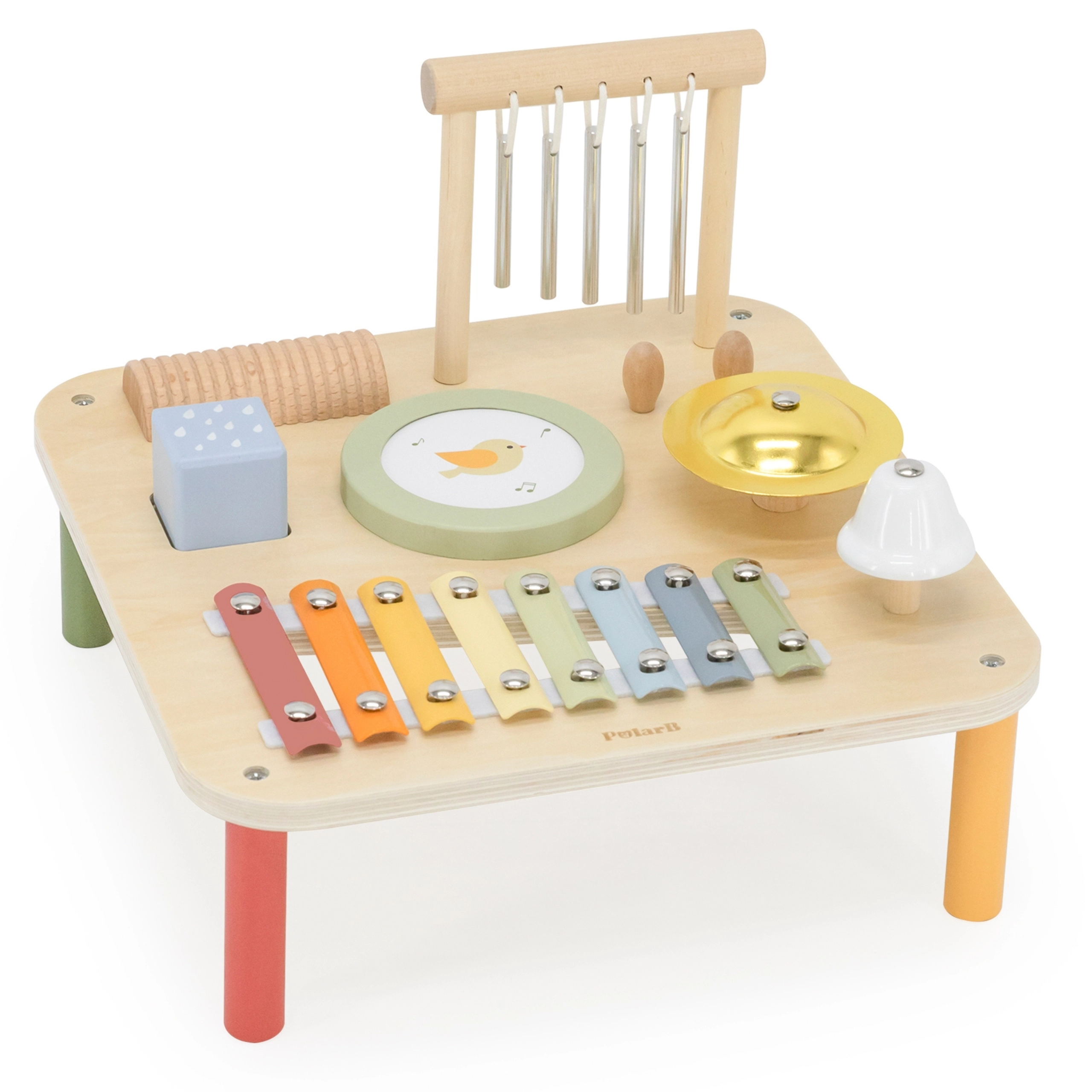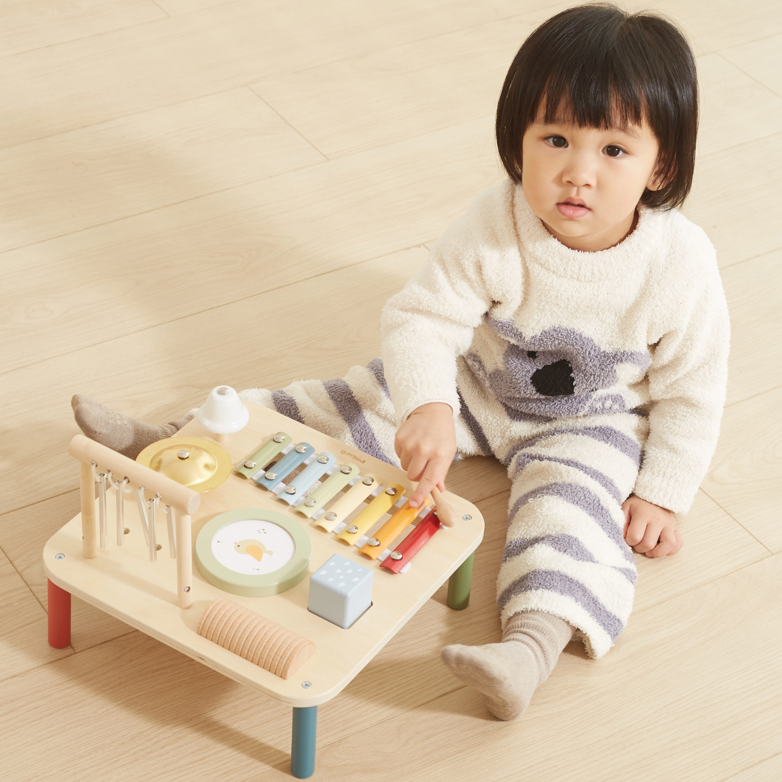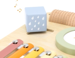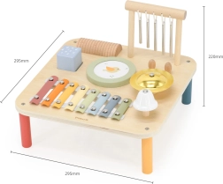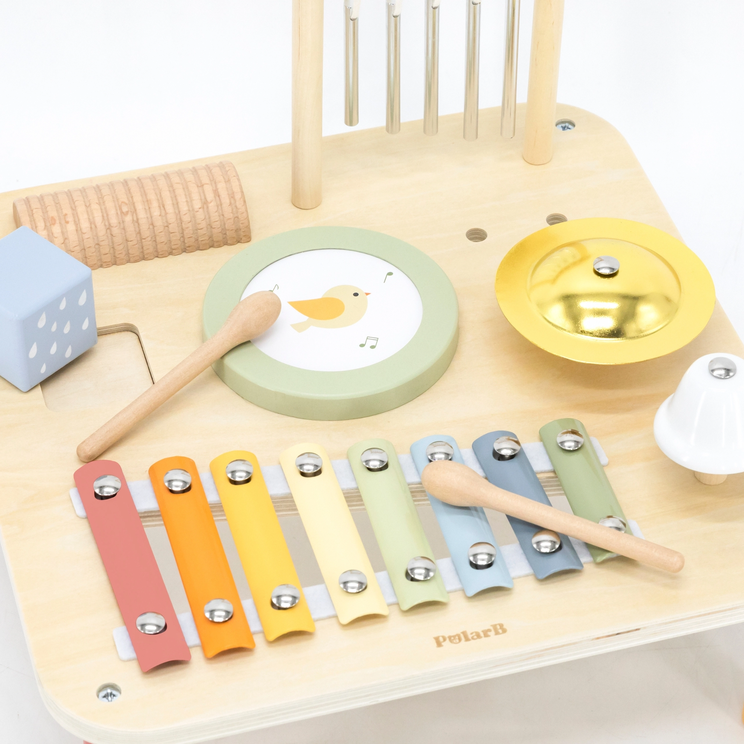 La mesa incluye varios instrumentos que ayudan a desarrollar el oído musical y el sentido del ritmo de tu hijo.