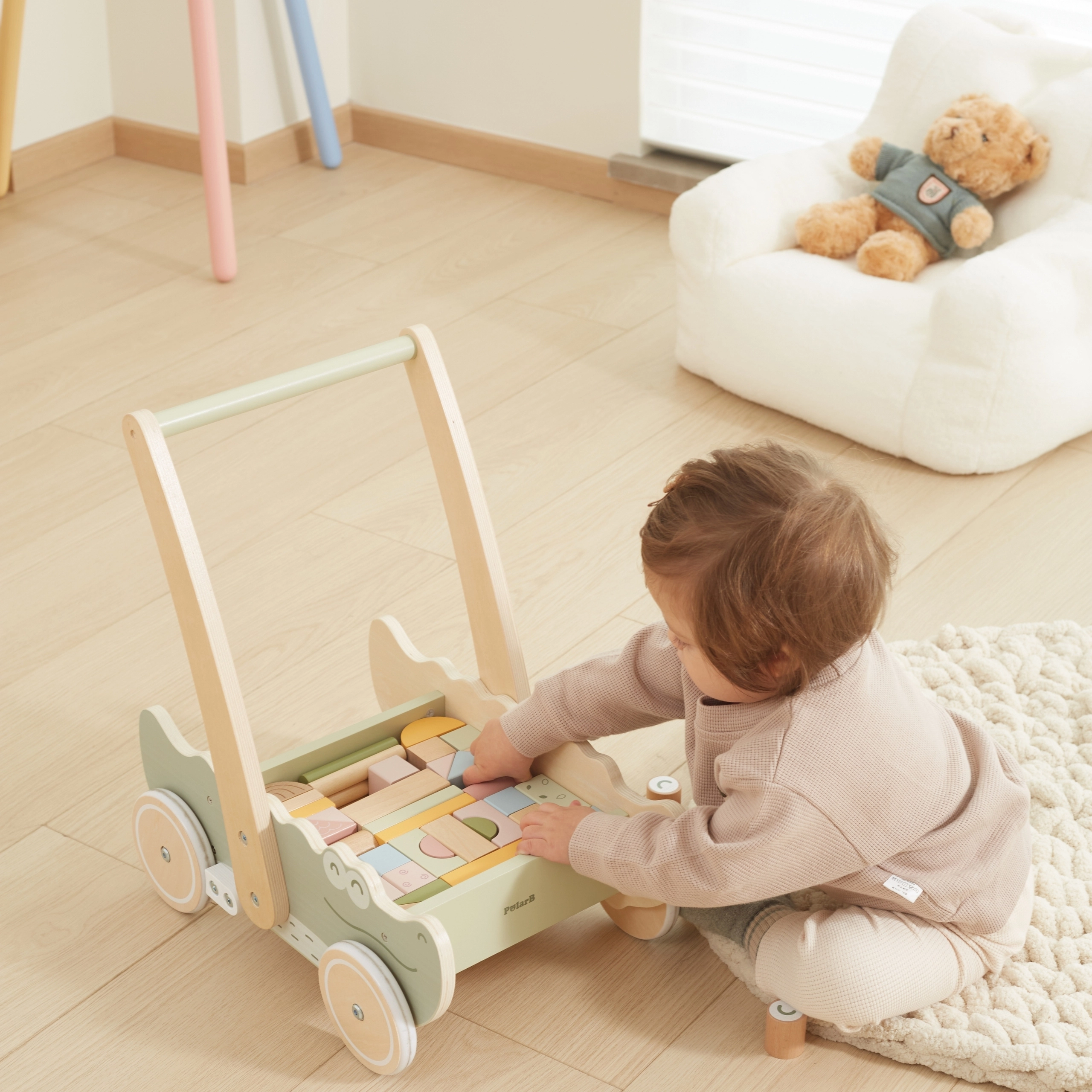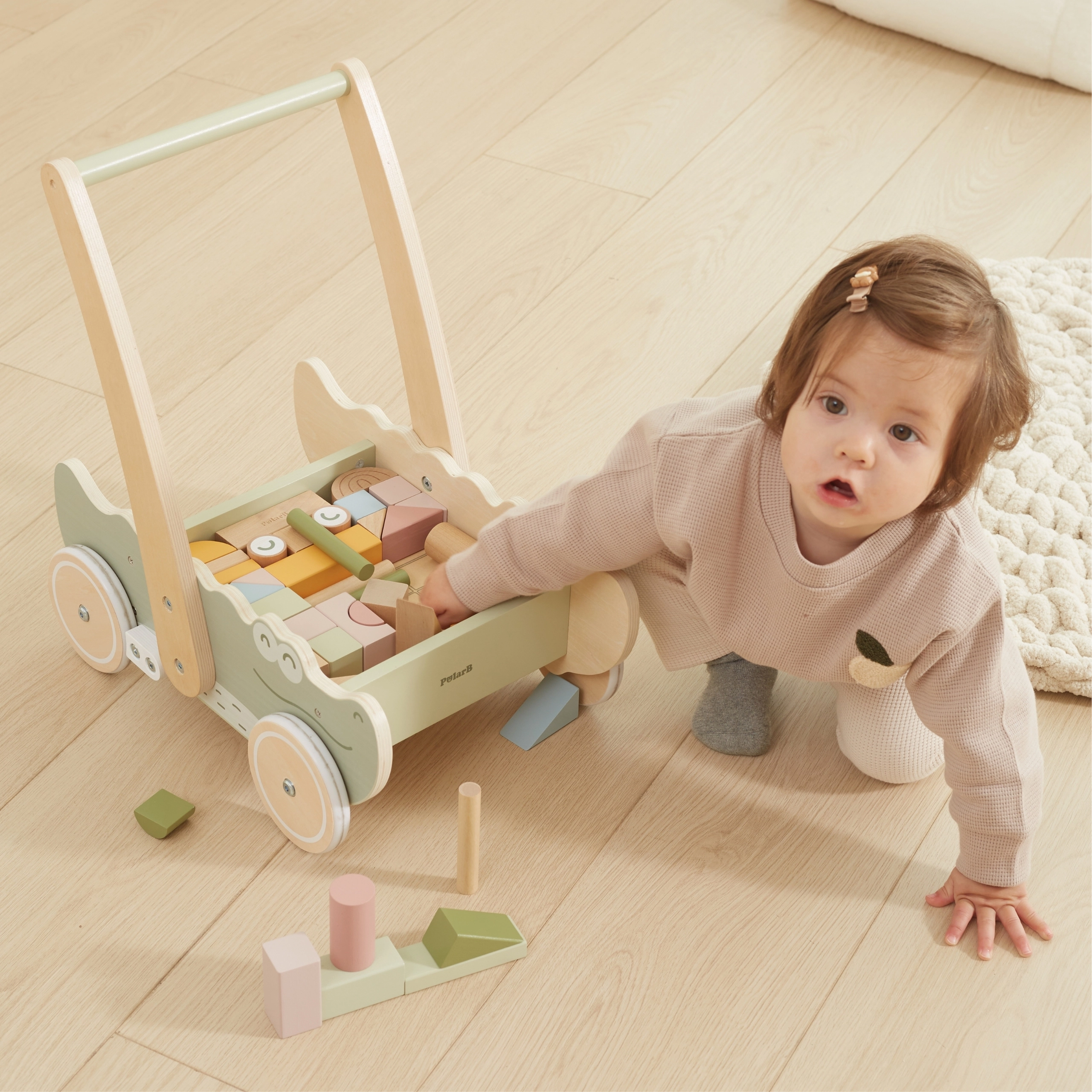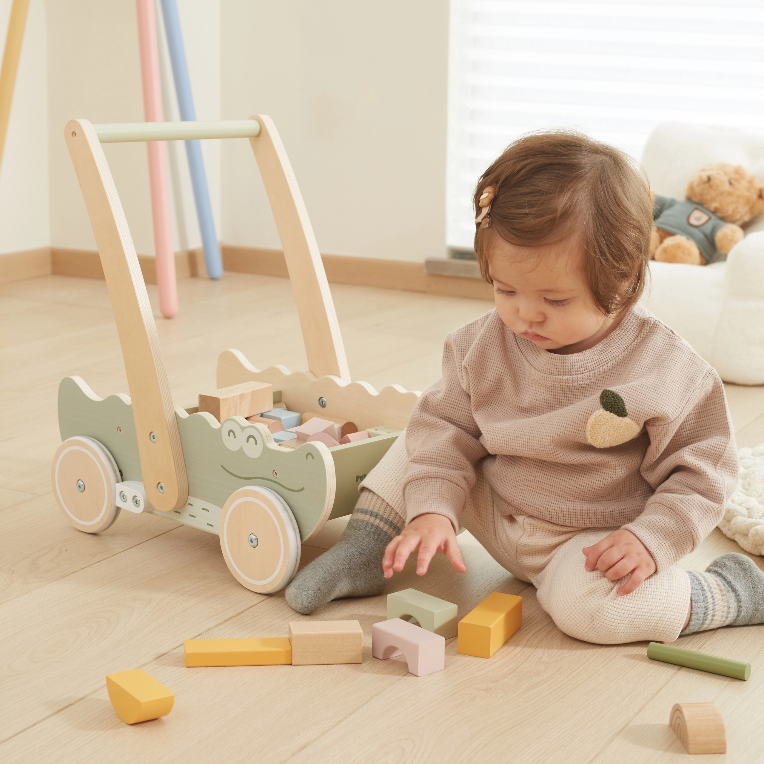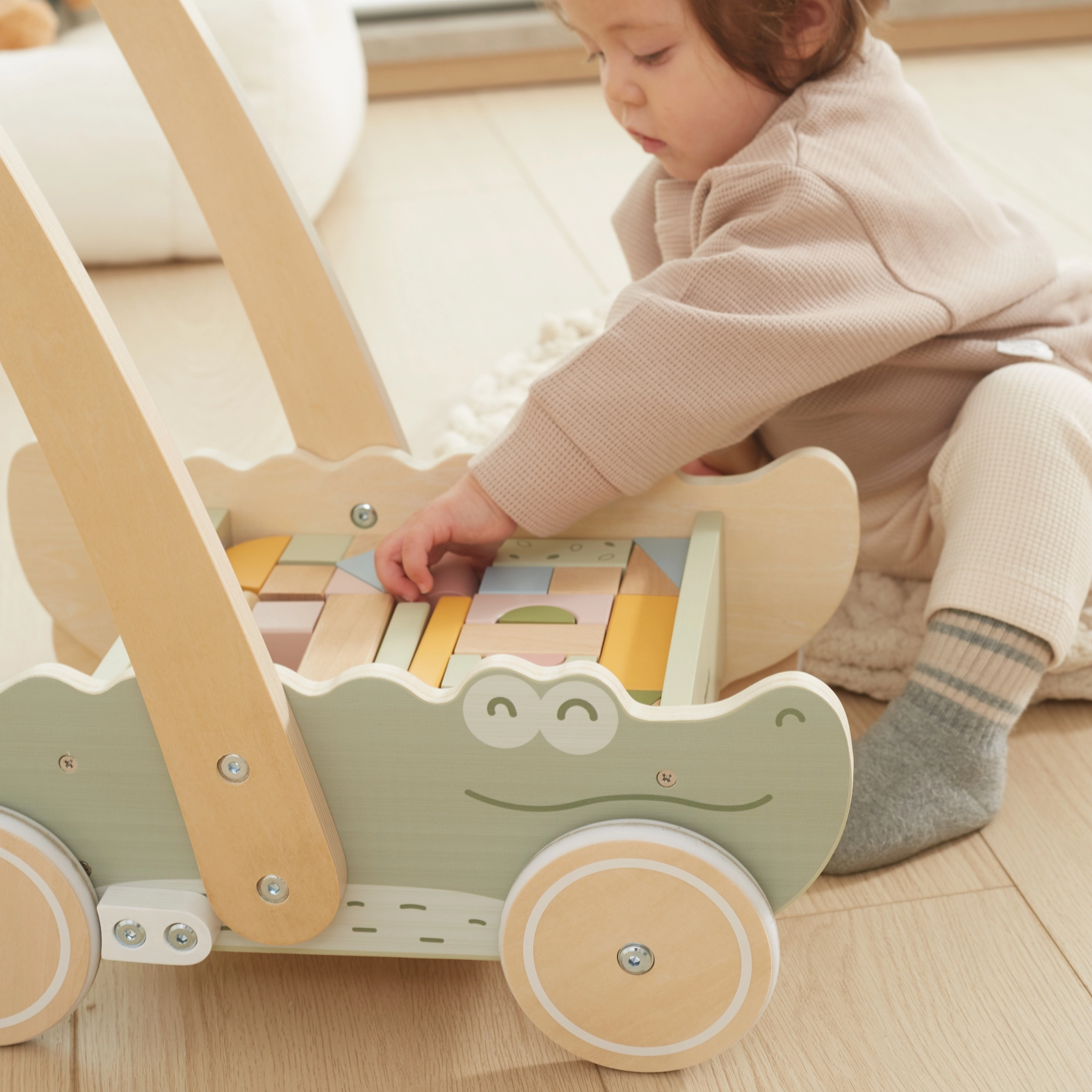 Los bloques de colores en distintas formas y tonos pastel no solo fomentan la creatividad lúdica, sino que también desarrollan su motricidad fina. Las suaves ruedas de goma protegen los suelos y garantizan un movimiento fluido. ¡Este cocodrilo de diseño encantador y colores suaves se convertirá en el juguete favorito de cada niño!