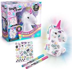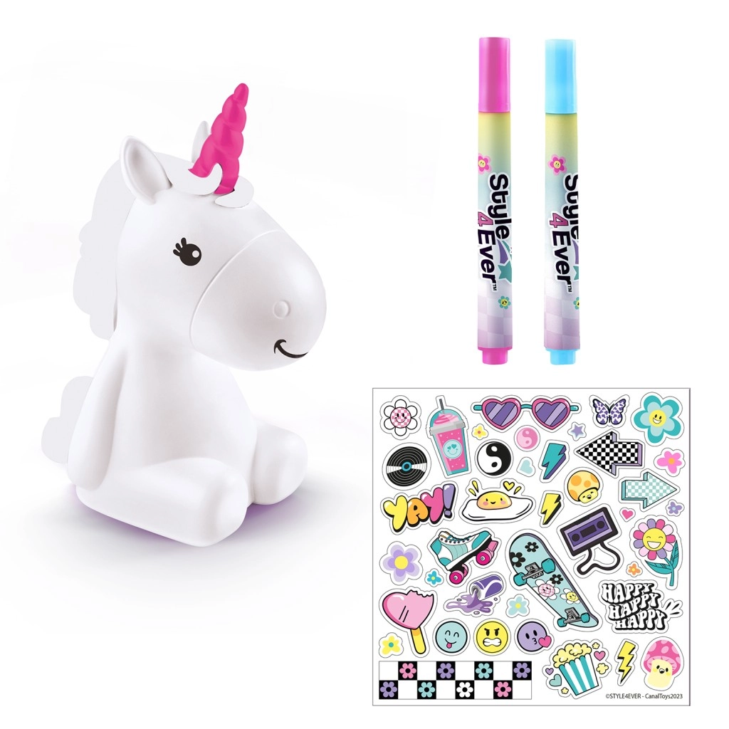 Aporta magia al cuarto infantil con el set creativo Style4Ever unicornio luminoso, que los niños pueden decorar por sí mismos. Tras terminar, el unicornio brilla con 8 colores y crea una atmósfera acogedora. El paquete incluye una figura luminosa, 4 rotuladores, pegatinas y un manual sencillo; además, las pilas están incluidas. A partir de 6 años.