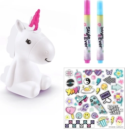 Sin necesidad de buscar accesorios: todo lo necesario está dentro. El unicornio brilla en 8 colores diferentes y, gracias a los rotuladores y pegatinas incluidos, crearás fácilmente un diseño original. Las pilas 3× LR1130 (1,5 V) ya están incluidas, por lo que puedes empezar a crear nada más abrir la caja.