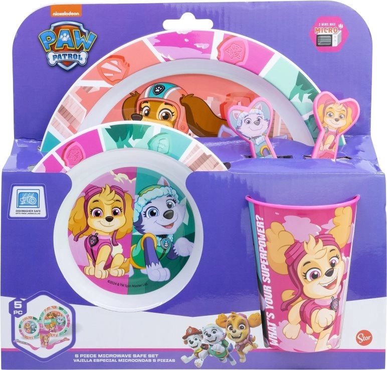 Un adorable y práctico juego de comedor infantil 5 en 1 con motivo de PAW PATROLcolorido estampado. Incluye platito, cuenco, cucharita, tenedor y vaso. El set es libre de BPA y el vaso es apto para microondas (600 W / 2 min).