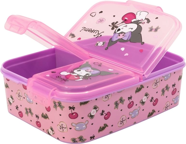 Práctico recipiente para el almuerzo con el motivo de KUROMI que ofrece 3 compartimentos separados para organizar los alimentos con claridad. Está fabricado con material resistente, no contiene BPA y, gracias a su licencia oficial, encantará a los pequeños fans. Ideal para la escuela, el parque y las excursiones.