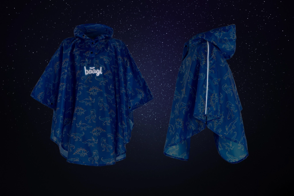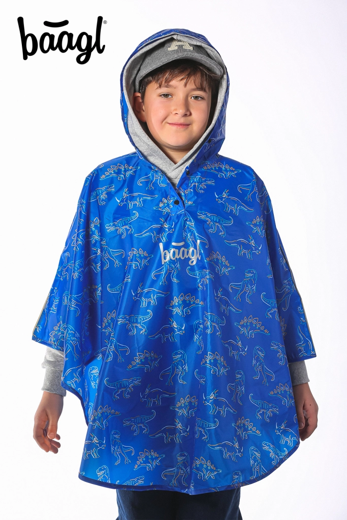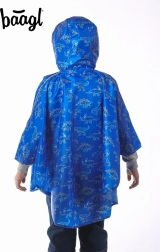 Elegante poncho infantil BAAGL con capucha y visera que ofrece una protección impermeable fiable para la escuela y las excursiones. Su material ligero es cómodo de llevar, los elementos reflectantes aumentan la seguridad y el corte pensado para llevar sobre la mochila mantiene todo seco incluso con cartera. Incluye una bolsa práctica con cierre de cordón a juego.