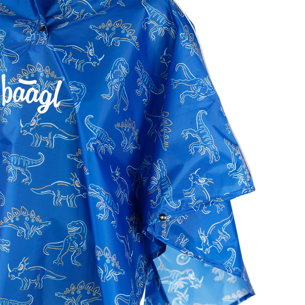 El poncho infantil BAAGL Dino en color azul con divertido estampado de dinosaurios es el compañero ideal para la lluvia. Está fabricado con material ligero e impermeable que no limita el movimiento y protege de forma fiable contra la humedad. La capucha con visera evita que el agua caiga sobre la cara y los corchetes facilitan el vestir.