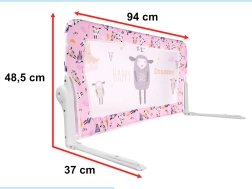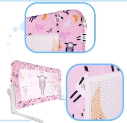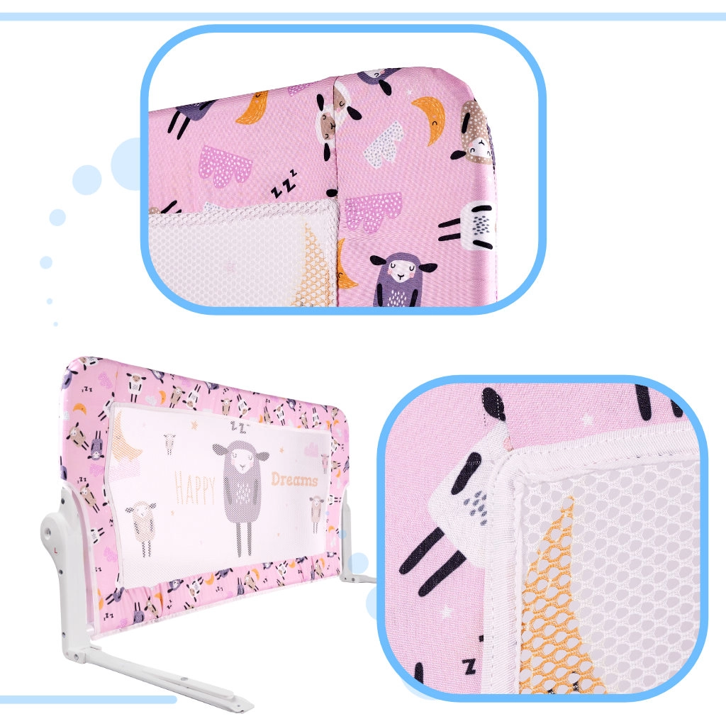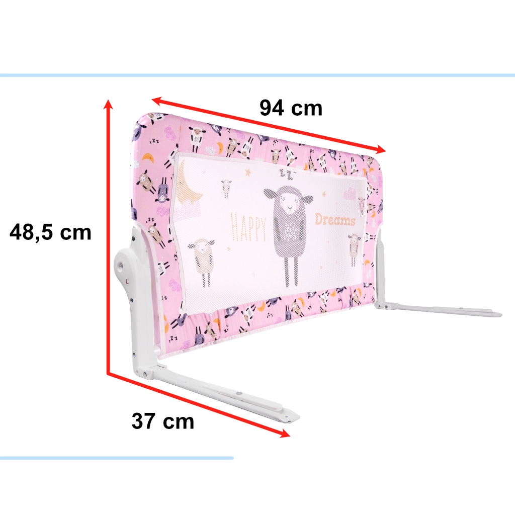 Práctica barandilla infantil para cama de 90 cm de ancho con motivo de ovejitas que evita que el niño se caiga durante el sueño. Gracias a su mecanismo abatible se desplaza fácilmente, cuenta con un resistente marco metálico y una malla transpirable para una mejor vigilancia. Sueño seguro, montaje sencillo y diseño universal para cualquier habitación infantil.
