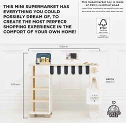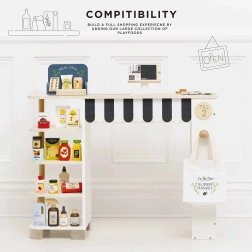 - Puesto con estantería, caja registradora, cinta transportadora, escáner, dinero de juguete, tarjetas de pago/recompensa/fidelidad, letrero “siguiente cliente”, pizarra para escribir y pizarra con oferta especial, bolsa de algodón, surtido de alimentos de madera