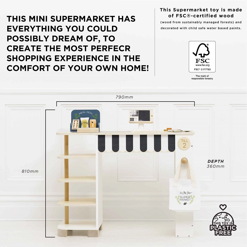 Crea para los niños su propia tienda con el precioso puesto de madera de LE TOY VAN. Este set incluye caja registradora, cinta transportadora, escáner y un amplio set de alimentos para un juego de compras realista. Fabricado en madera FSC y algodón natural, 100% libre de plástico, seguro y resistente para el juego diario.