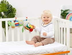 Las presillas textiles sujetan el juguete a la cuna, el cochecito o la silla de coche: el compañero ideal en casa y en las salidas.
