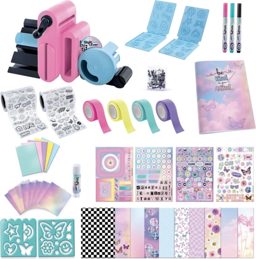 Incluye más de 150 accesorios: hojas de papel, pegatinas en blanco y negro y en color, rotuladores, pegamentos con purpurina, cintas decorativas y plantillas temáticas con motivos de flores, mariposas, estrellas y textos como “Be Happy” o “Cool”. En el paquete también encontrarás un pequeño cuaderno para usar de inmediato las nuevas decoraciones.