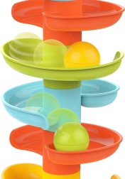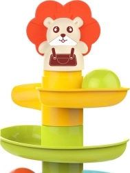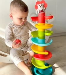 Construye una colorida torre en espiral y observa cómo las bolitas descienden por los niveles. Las piezas del circuito se encajan con facilidad, por lo que los niños pueden construir una y otra vez, entrenando la paciencia y la creatividad. Cada una de las 6 bolitas de colores emite un agradable traqueteo al moverse, estimulando los sentidos y alargando el tiempo de juego.