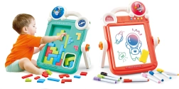 Descubre un centro creativo para niños: la pizarra de doble cara 2 en 1 de WOOPIE, que combina dibujo con rotuladores borrables en seco y ensamblaje de piezas tipo Tetris. Incluye 8 rotuladores, borrador, 18 tarjetas de doble cara borrables, estructura estable con patas y asa, botones con sonidos y reloj analógico para aprender la hora.