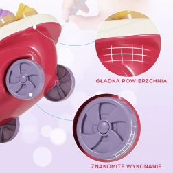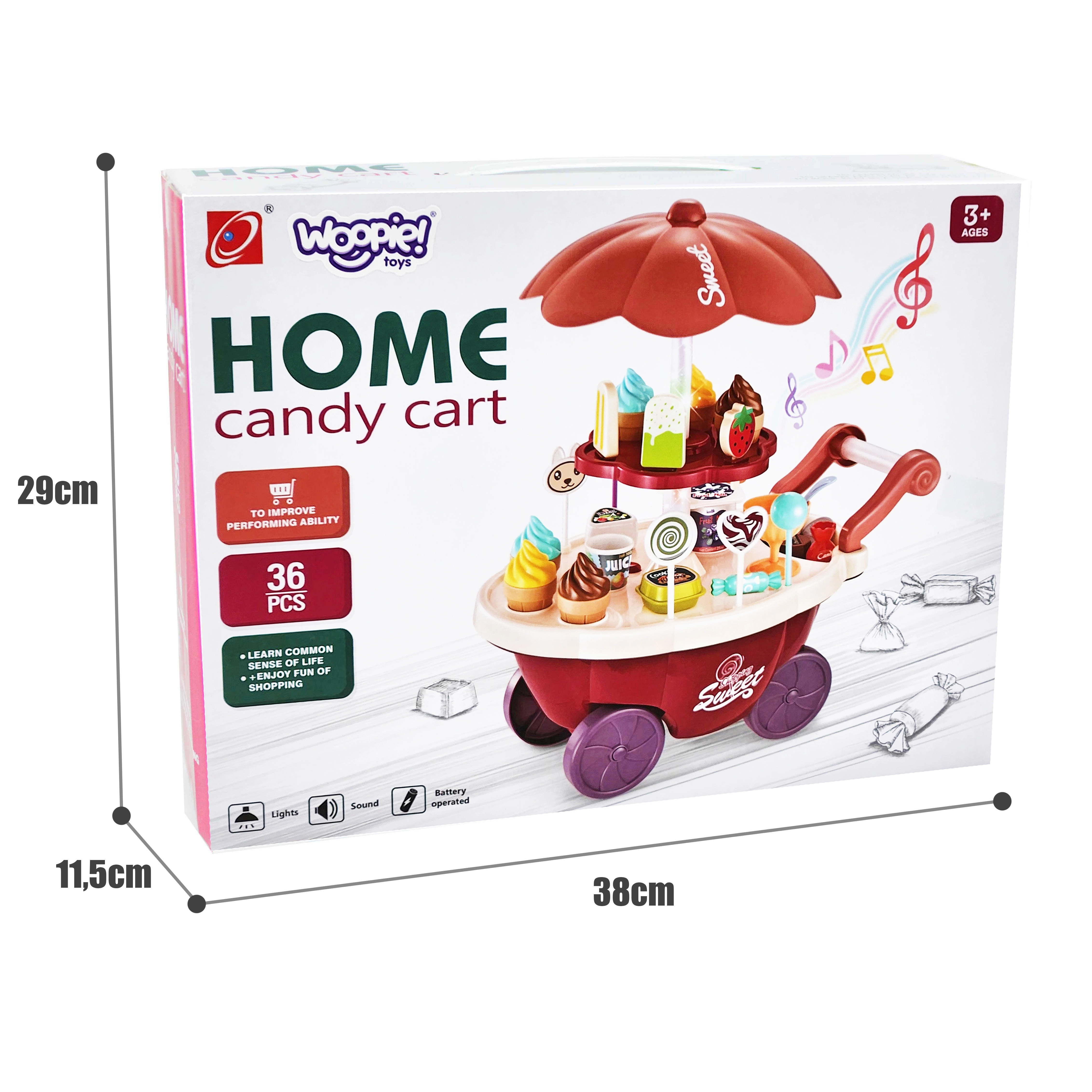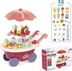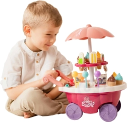 Este juguete simula el papel de vendedor y comprador, lo que ayuda a desarrollar habilidades sociales y conciencia. El carrito incluye muchos accesorios de calidad y pegatinas para jugar y vender helados y dulces. El juguete permite aprender habilidades matemáticas y financieras básicas mediante compras simuladas con la ayuda de monedas incluidas.