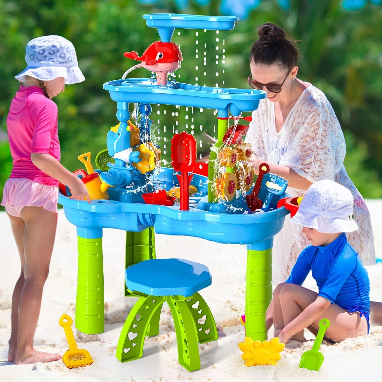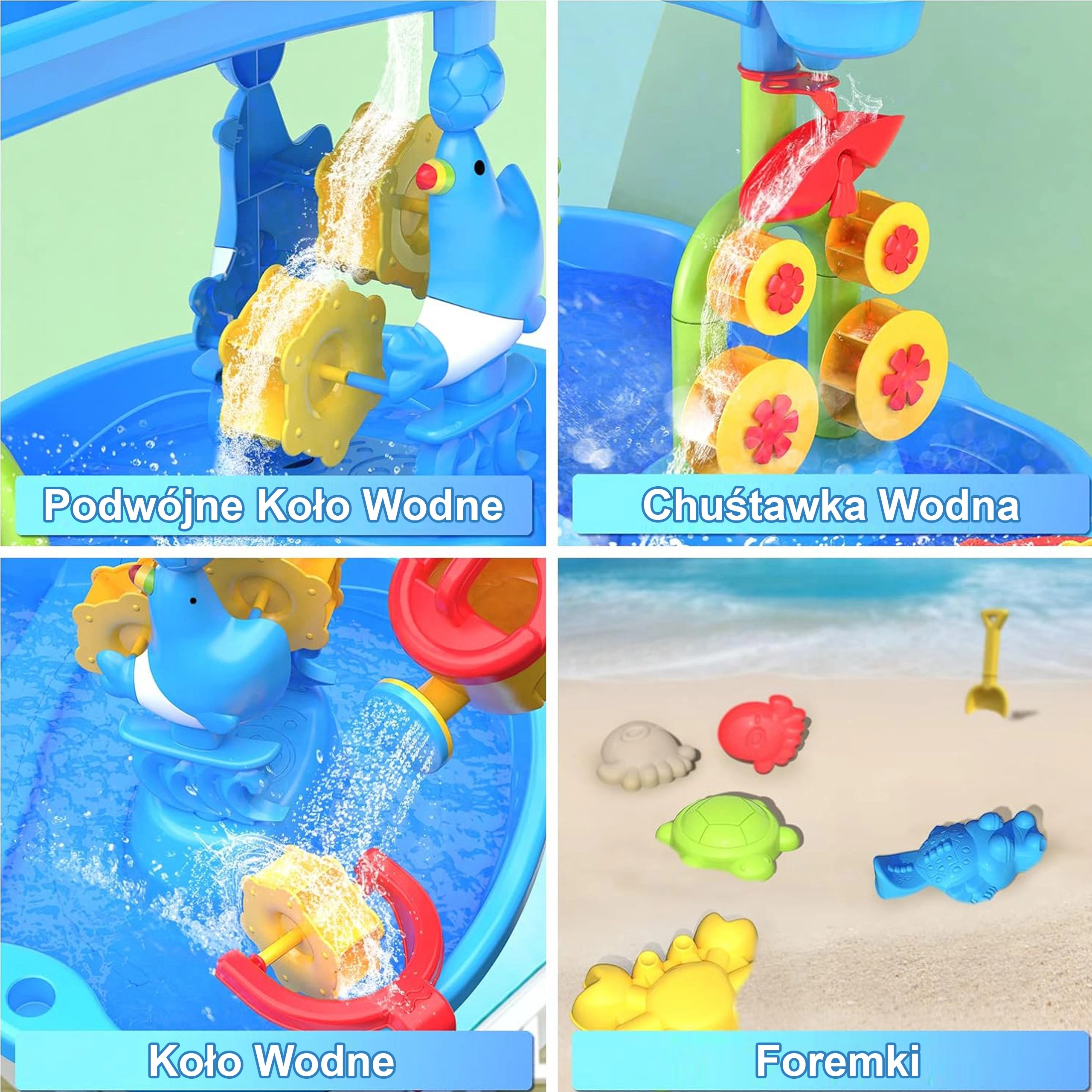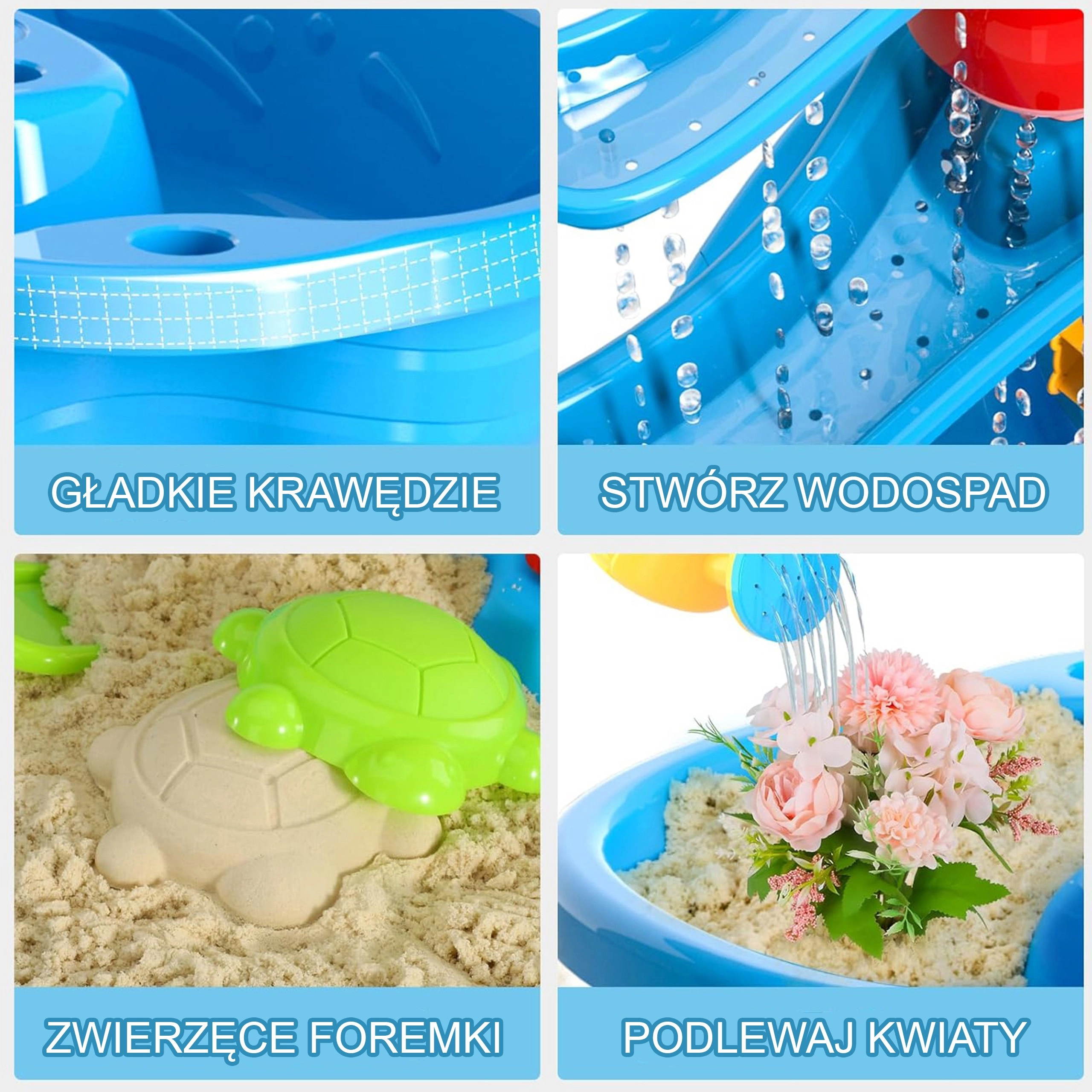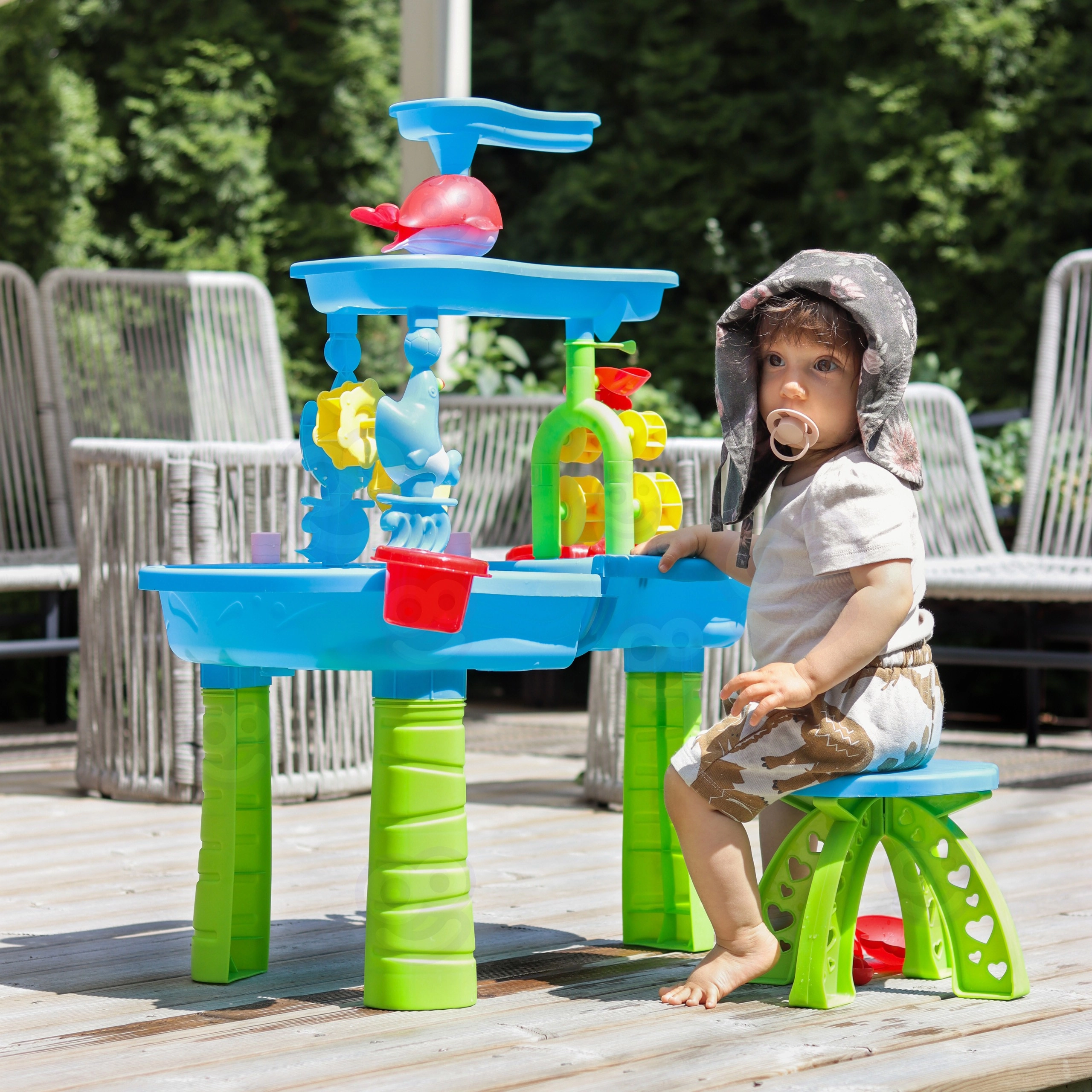 La mesa de agua y arena WOOPIE XL ofrece diversión todo el año: en verano, refrescantes atracciones acuáticas; en épocas más frías, juego con arena o arena cinética. Gracias al sistema de cascada de 3 niveles, los niños vierten agua en el depósito superior y observan cómo la corriente hace girar las ruedas y molinos de agua y fluye hacia las bandejas inferiores. Incluye también un taburete y un amplio conjunto de herramientas para jugar y experimentar.