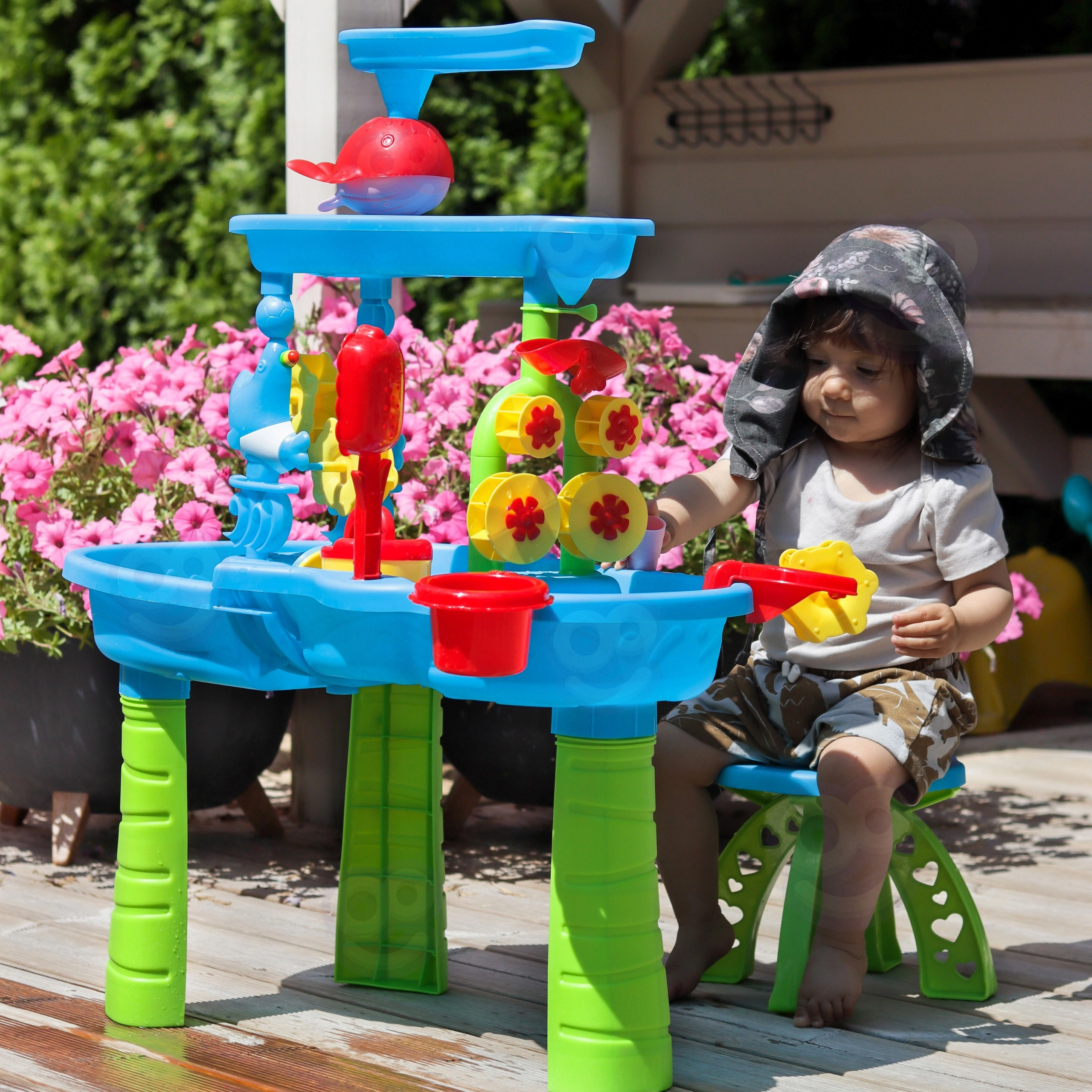 Vierte en el depósito superior y observa cómo el agua fluye por los canales, hace girar las ruedas y atrae a los niños a explorar causas y efectos.