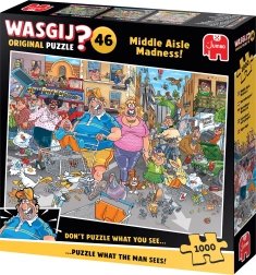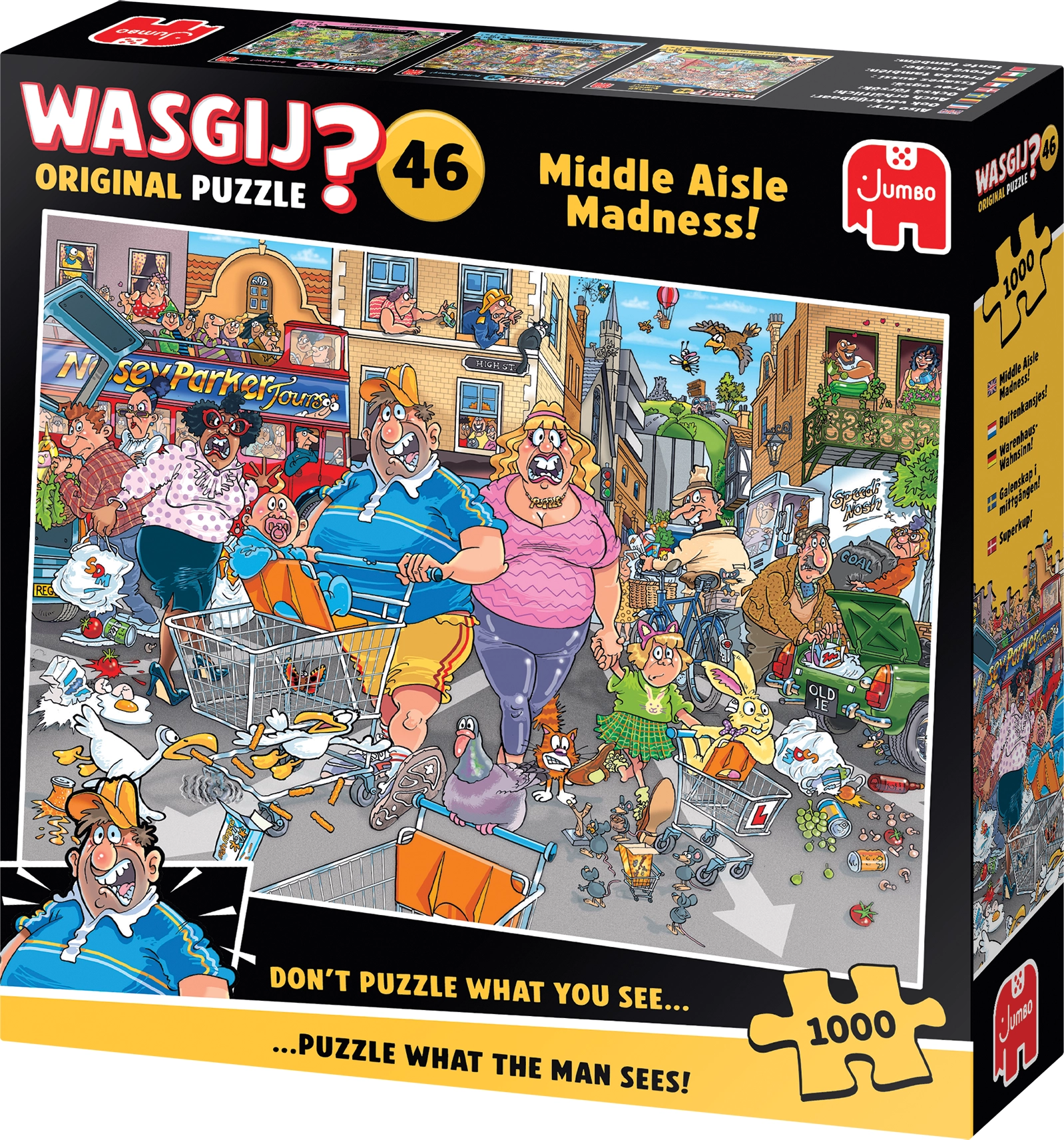 Puzzle JUMBO WASGIJ 46: La locura de la calle principal le da la vuelta al montaje tradicional. En lugar del modelo de la caja, montas la escena desde la perspectiva de un personaje, que descubrirás gracias a pistas y ayudas en el embalaje. Así, cada montaje es diferente, emocionante y extraordinariamente divertido.