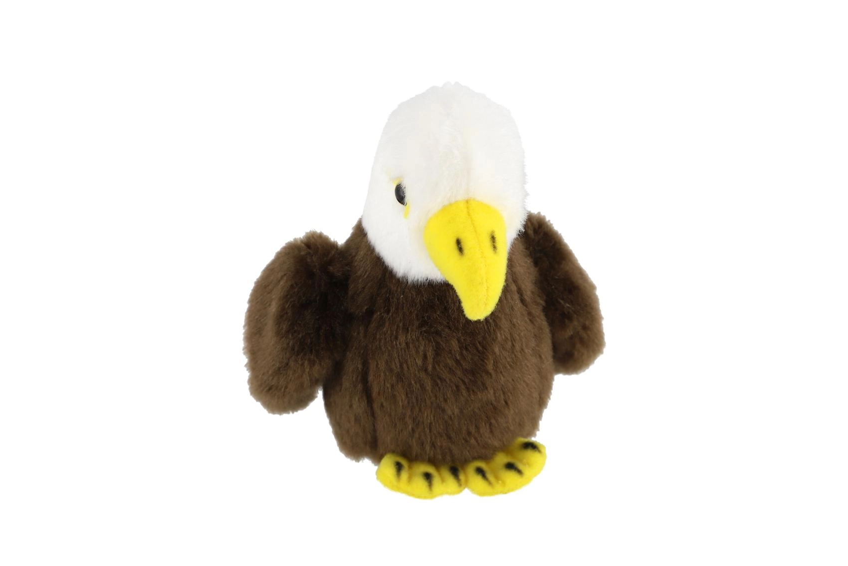 - Apariencia realista: cabeza blanca, cuerpo marrón, pico y garras amarillos.