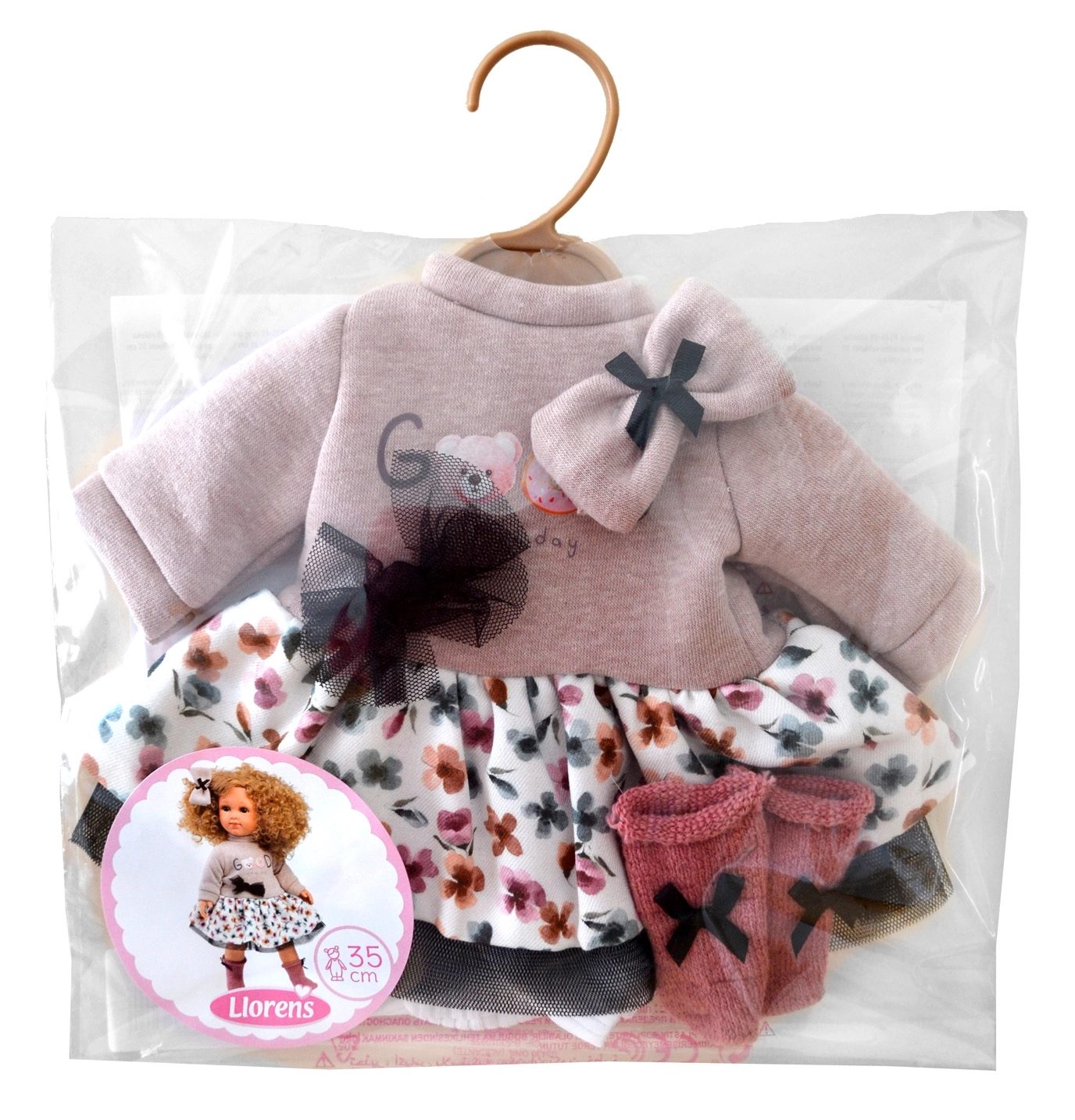 El set incluye un top de manga larga con lazo y detalle de tul, una falda floral con dobladillo de tul, calcetines suaves con lacitos y una goma decorativa para el cabello. Gracias a su talla universal, se pone fácilmente en muñecas de 35 cm y fomenta el juego creativo.