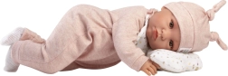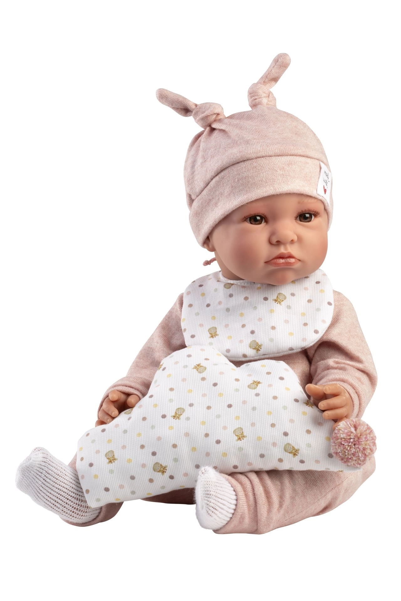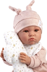 Muñeca realista parlante para niños a partir de 3 años, que al presionar el pecho dice “mamá”, “papá” y emite sonidos reales. Tiene el cuerpo de tela suave y brazos y piernas unidos con articulación.