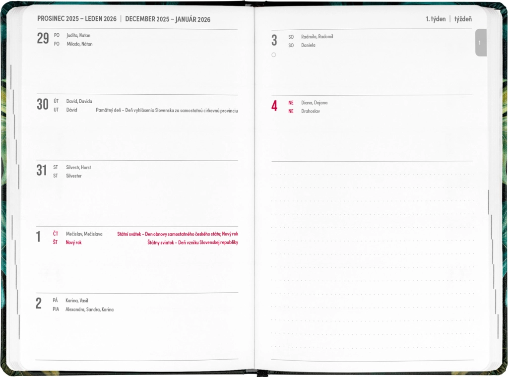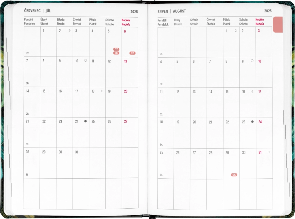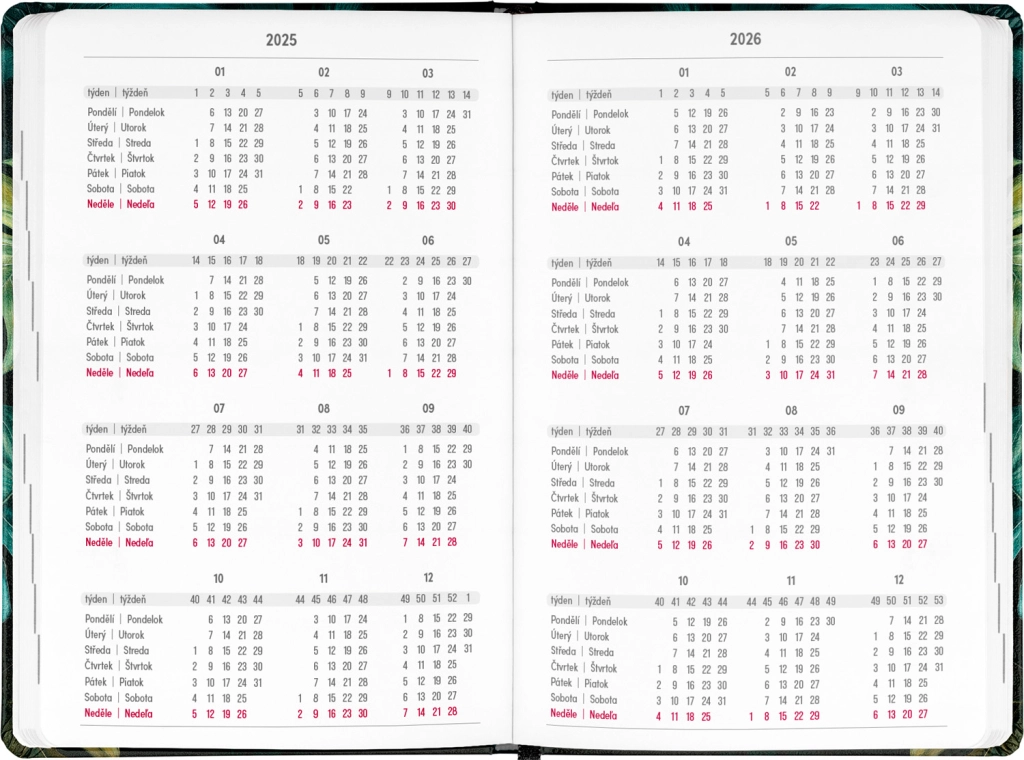 La agenda Petito Monstera es la ayuda ideal para planificar desde julio de 2025 hasta diciembre de 2026. Gracias al resumen de los años 2025 y 2026 y al calendario con nombres y festividades no solo en checo, sino también en eslovaco, tendrás todo lo importante siempre a mano. La práctica disposición facilita la orientación y el espacio para notas ofrece lugar para registrar tareas e ideas importantes. La agenda tiene un diseño elegante con motivo Monstera que encantará a cualquier amante del material de oficina con estilo.