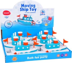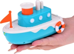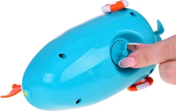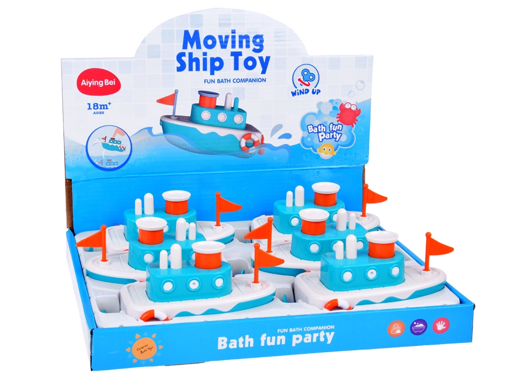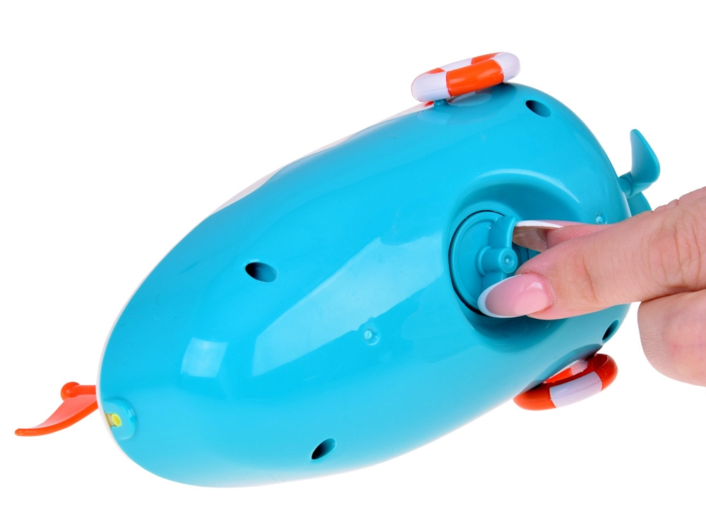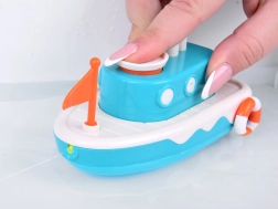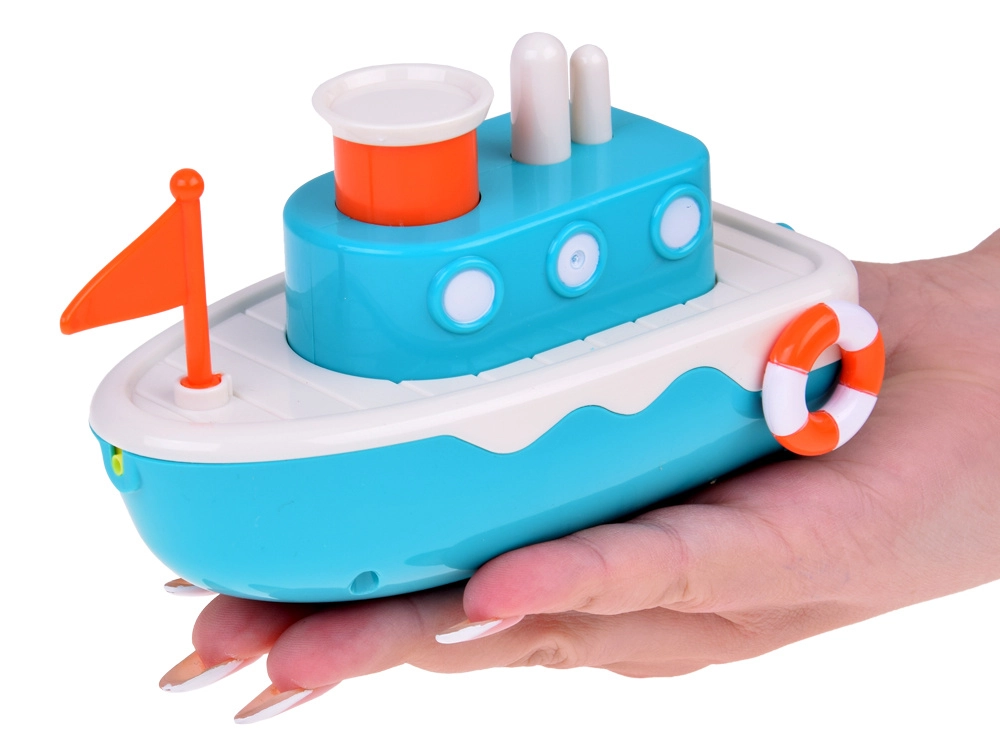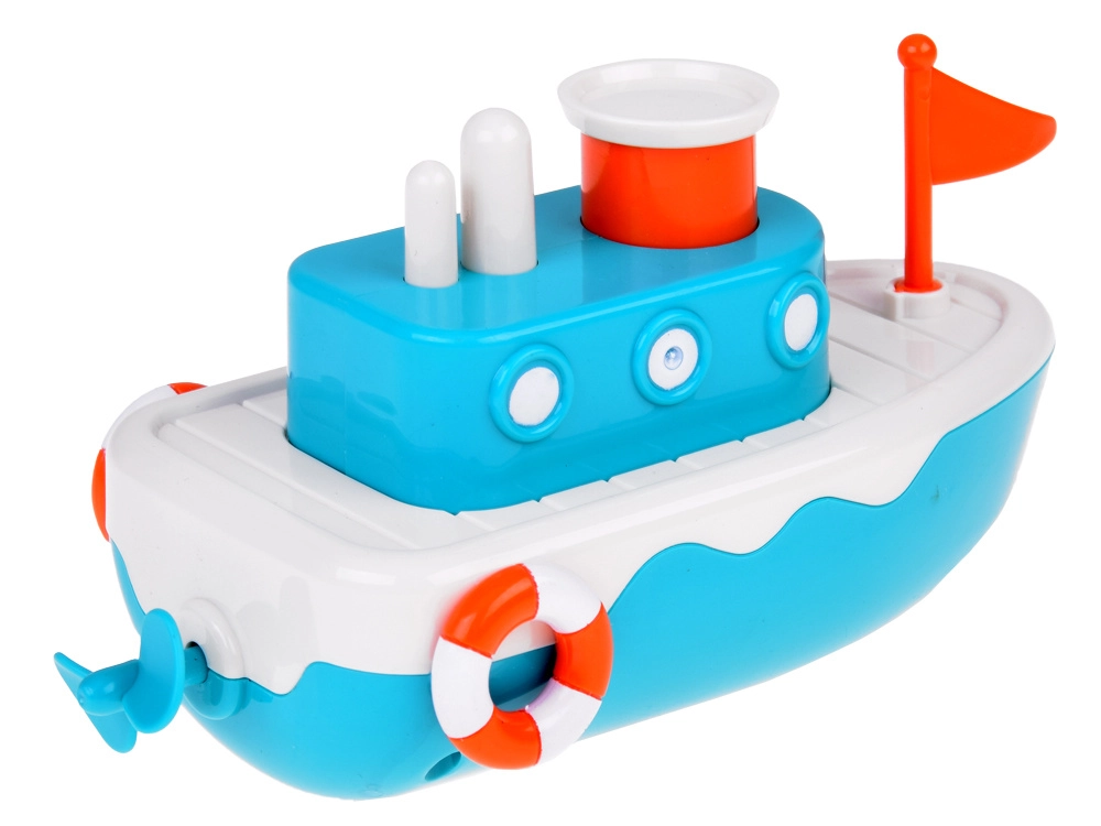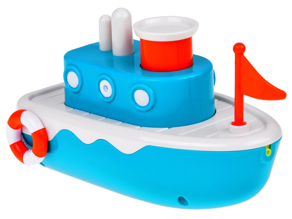 El juguete está equipado con un mecanismo que, tras darle cuerda, impulsa el barco hacia adelante. El botón en la parte superior del juguete expulsa chorros de agua, añadiendo un nivel extra de entretenimiento.
