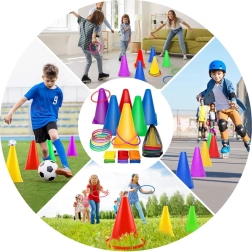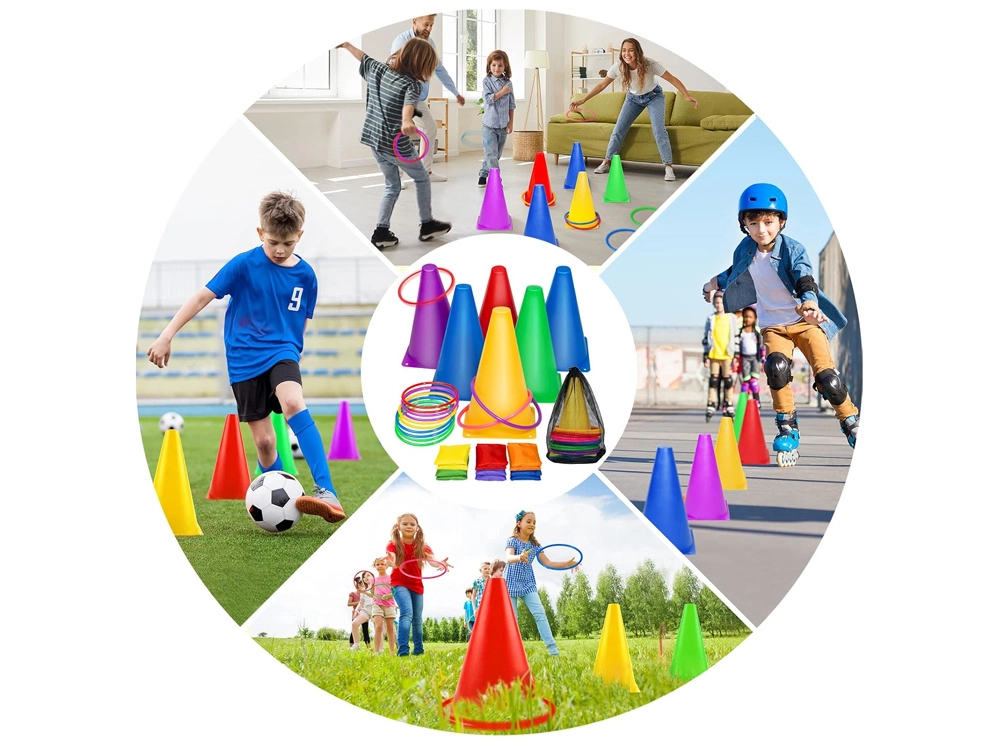 Este set incluye conos y aros en colores vivos que llamarán la atención y garantizarán la diversión durante el juego. Son excelentes para marcar el campo o estaciones.